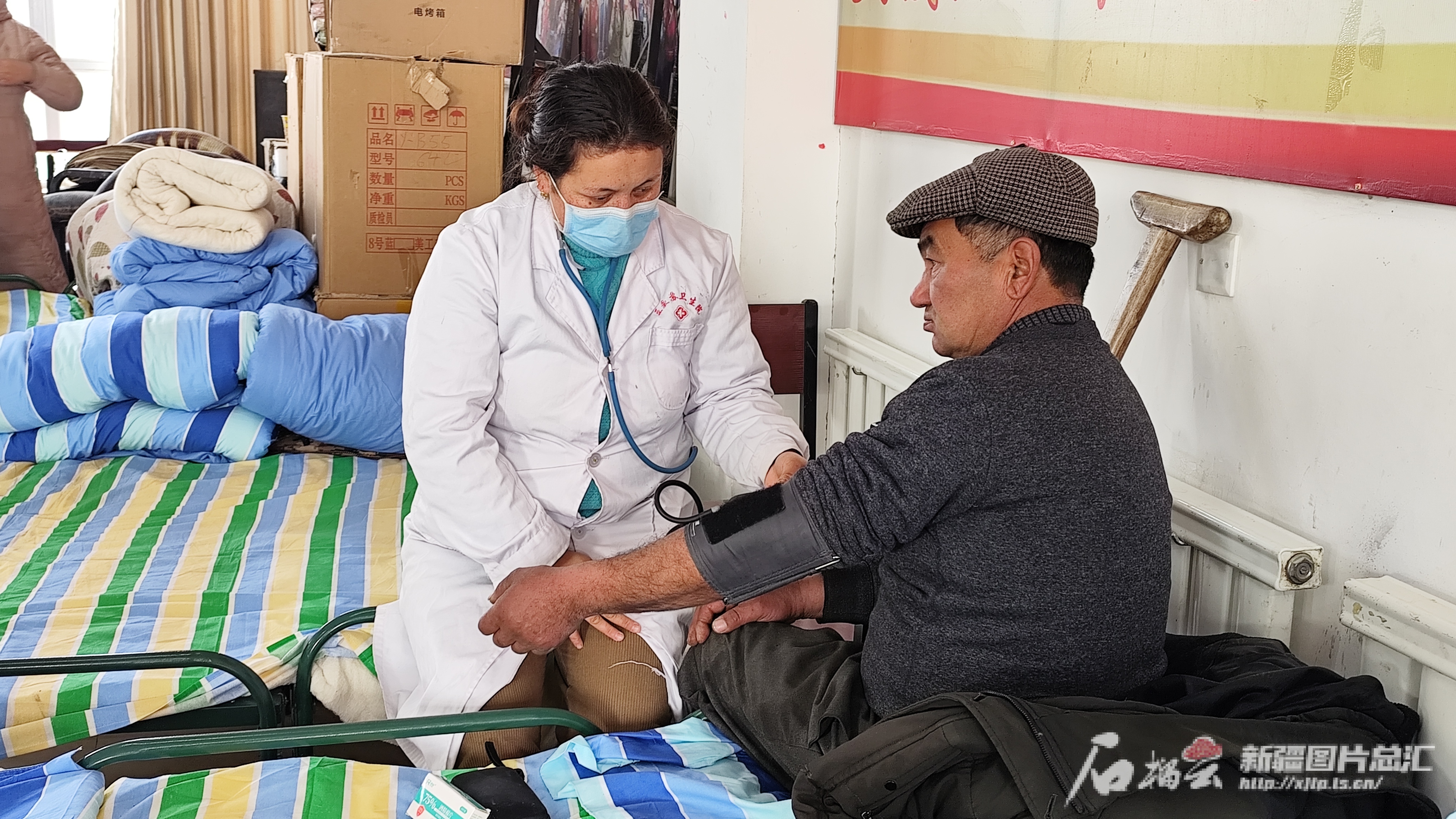 一上班,阿曼古丽拿起血压仪,戴上听诊器,对需要特别关心的村民们进行常规身体检查,询问大家的生活状况。虽然村里的医疗条件有限,但及时发现村民身体不适并给予针对性诊疗,阿曼古丽做到了。