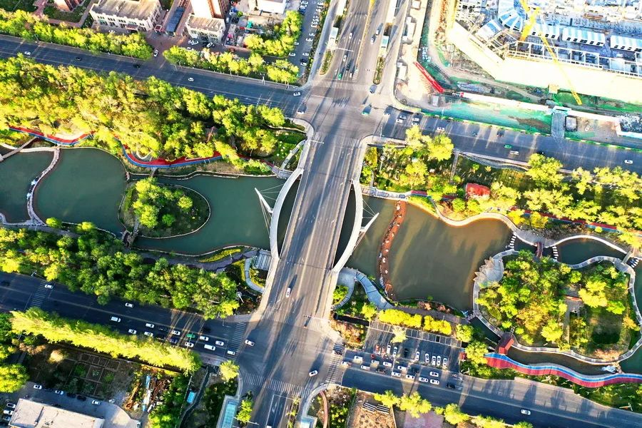 无人机拍摄的石河子市明珠河好似一条镶嵌于城市中的彩色缎带。图片来源:石河子零距离