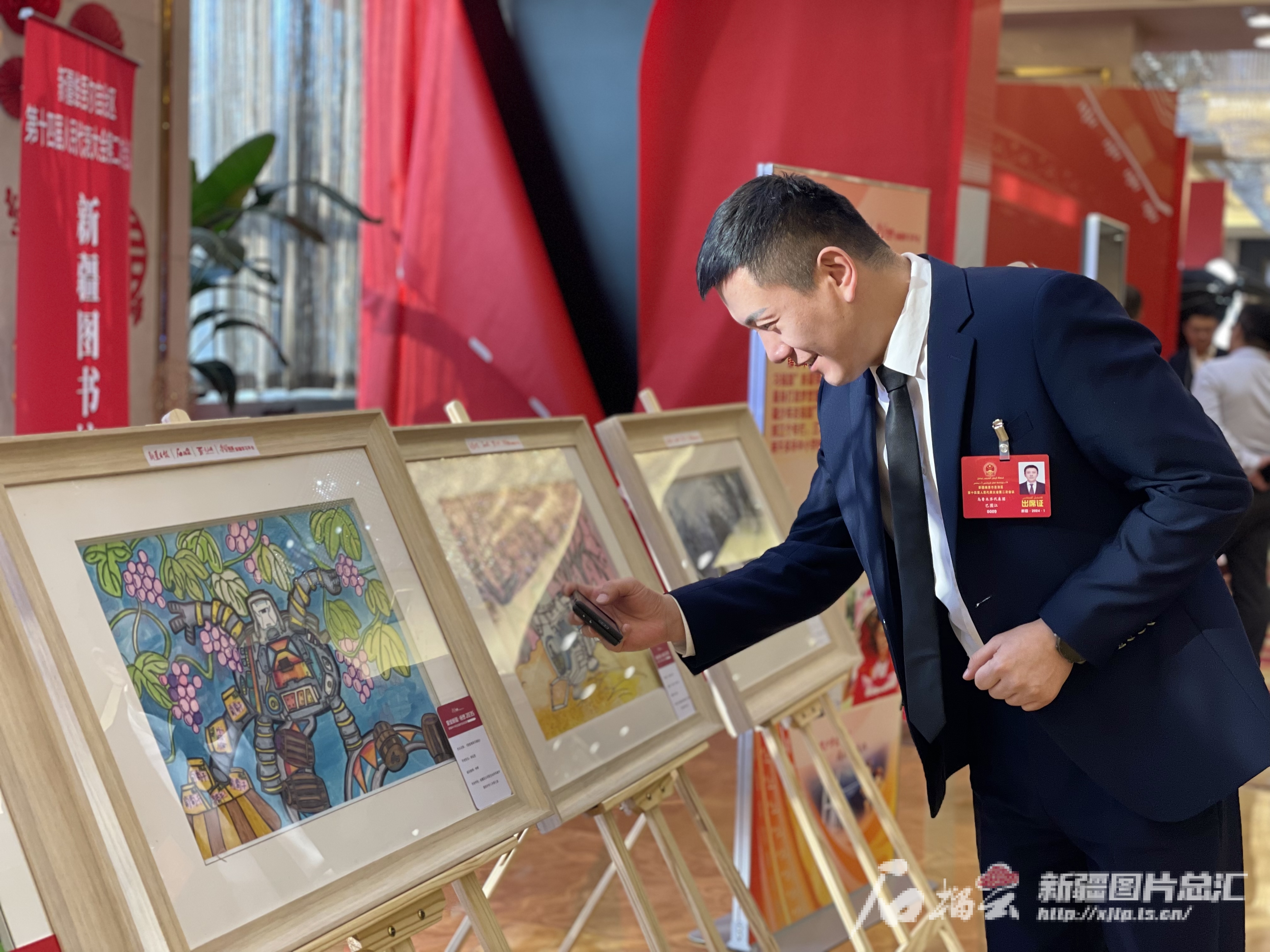 自治区人大代表、新疆艺术剧院话剧团国家二级演员巴图江被“童绘新疆”深深吸引,拍照留念。石榴云/新疆日报记者 刘翔 摄