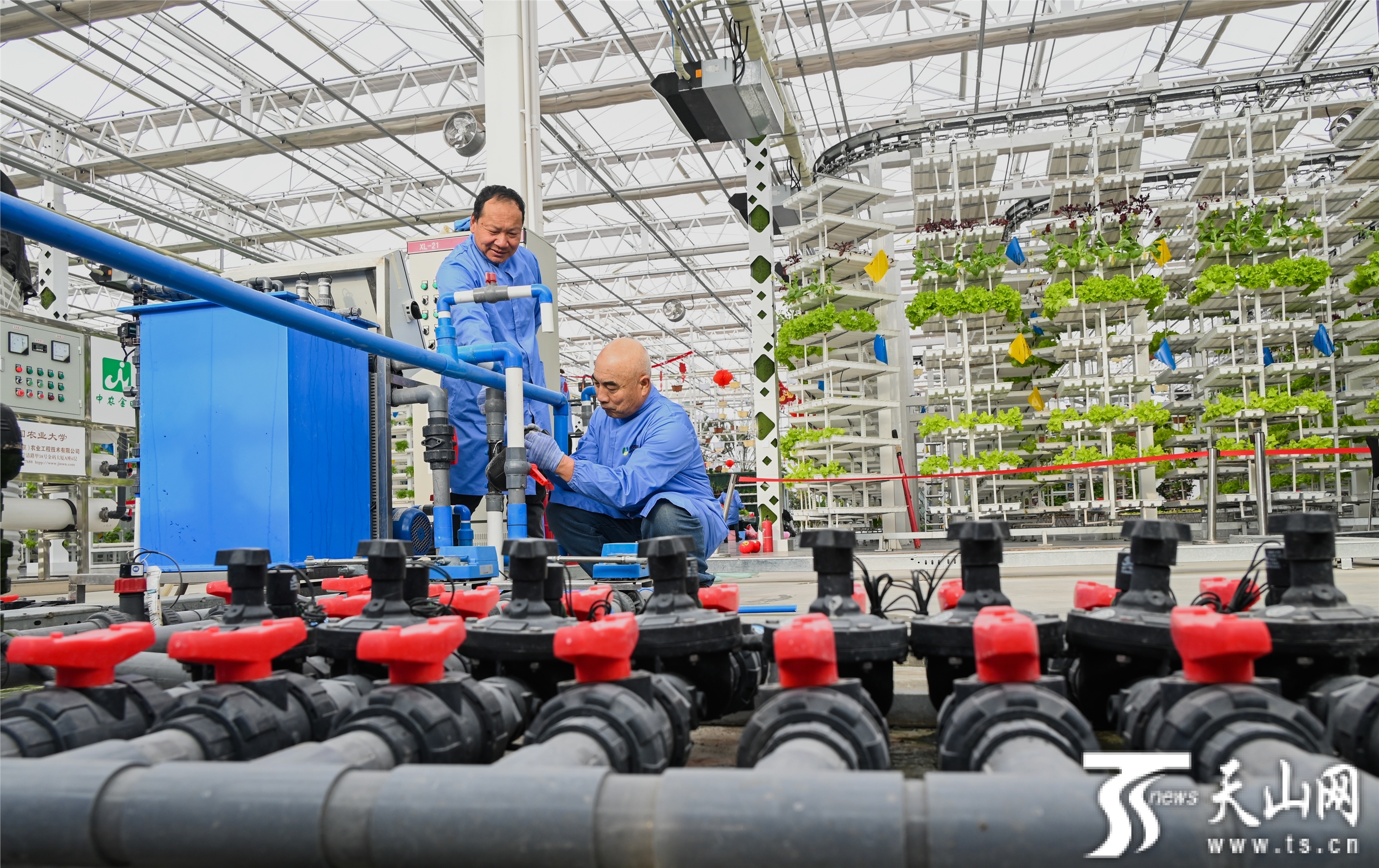 1月30日,工人在昌吉国家农业高新技术产业示范区新疆农业博览园内的未来农业科技馆对蔬菜供水设施进行维护。该馆集成使用精准水肥一体化灌溉等技术,既节水又省力。 陶维明摄