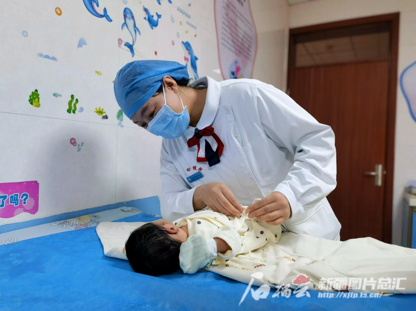 2月6日,乌鲁木齐市妇幼保健院家庭化病房内,护理师高雪向新手爸妈演示如何观察宝宝的面色和皮肤情况。宝宝在睡梦中咂咂嘴,始终没有被轻盈的动作惊扰酣梦。“每天看着新生儿,让人满心都是喜欢和希望。”说话间,她的双眼亮晶晶的。