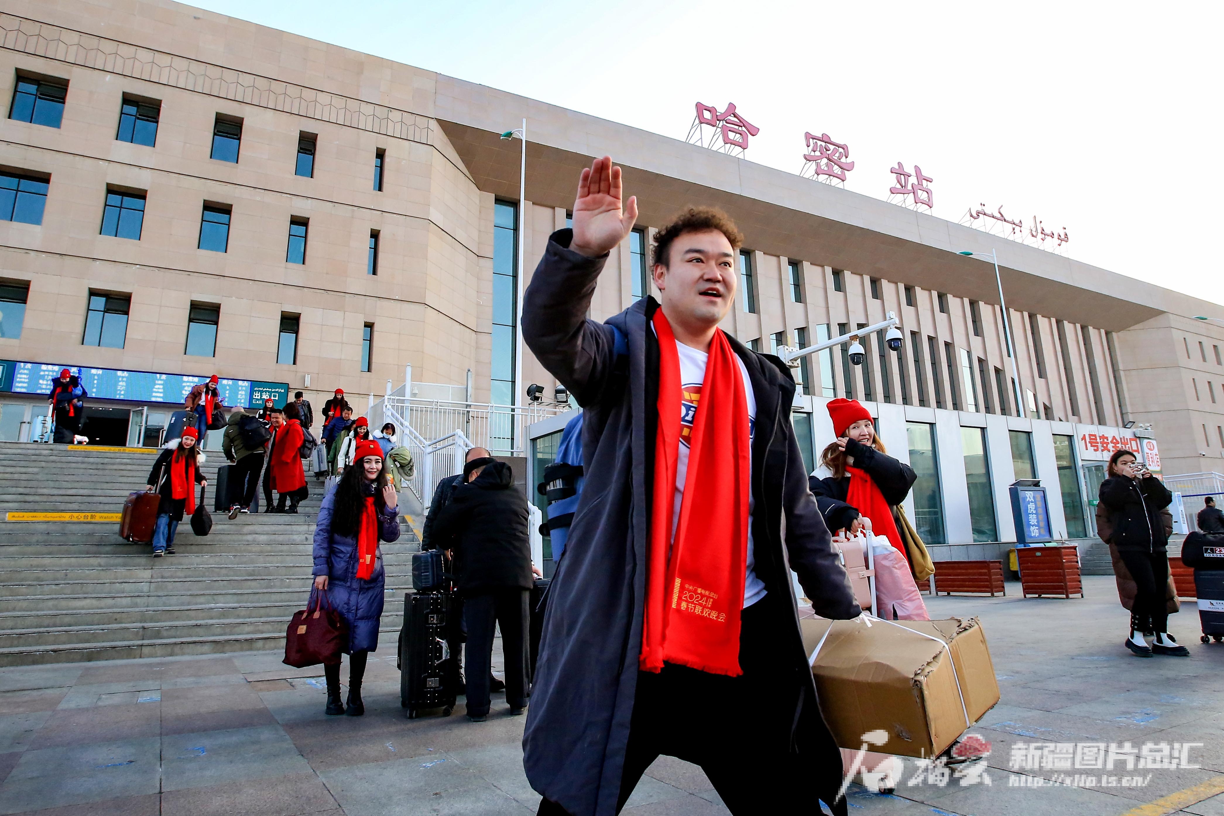 2月11日,参加中央广播电视总台《2024年春节联欢晚会》新疆喀什分会场演出的演员返回哈密。石榴云/新疆日报记者 蔡增乐 摄
