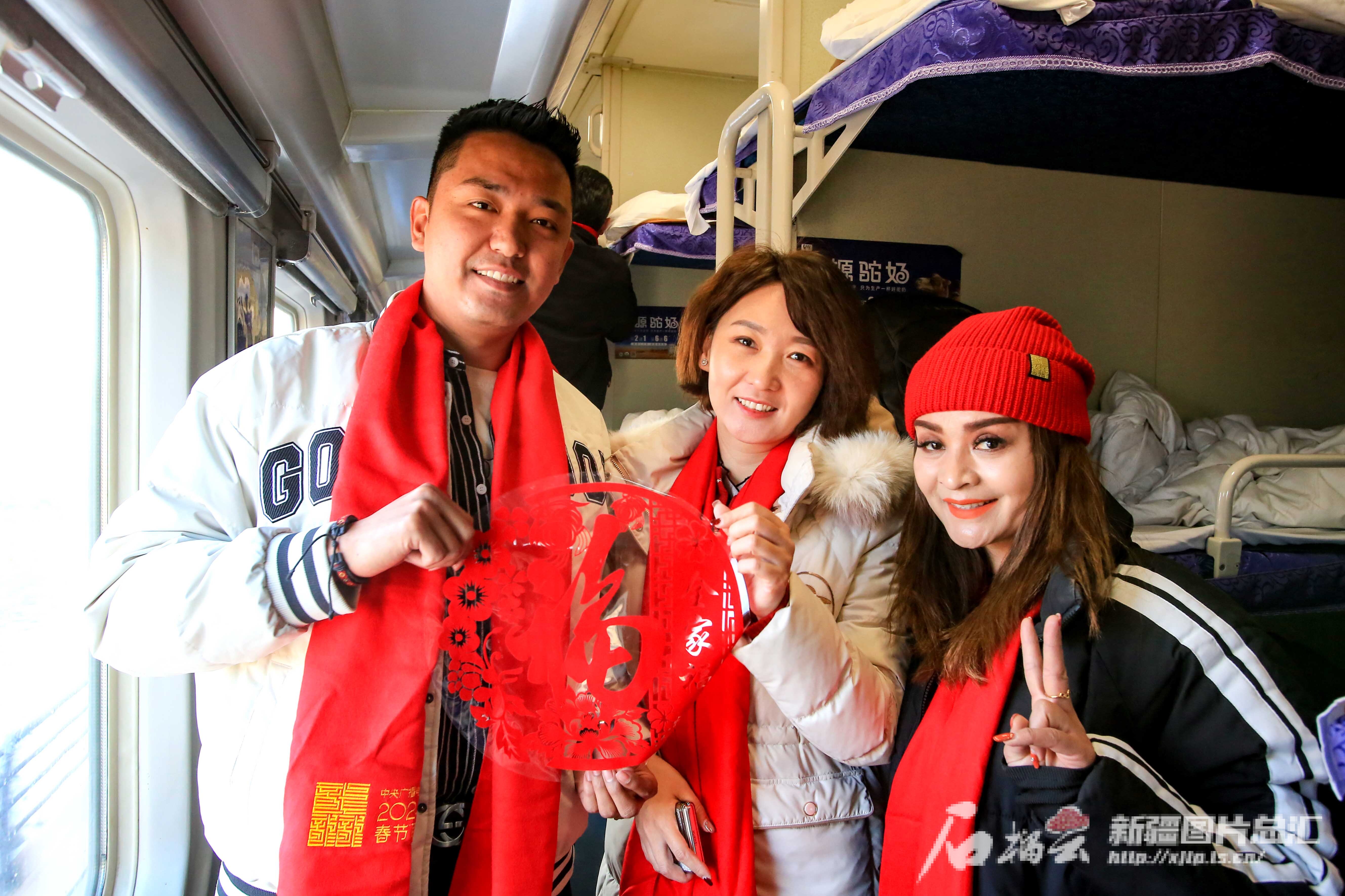 2月11日,参加中央广播电视总台《2024年春节联欢晚会》新疆喀什分会场演出的演员在由喀什开往西安的T270次列车上合影留念。石榴云/新疆日报记者 蔡增乐 摄