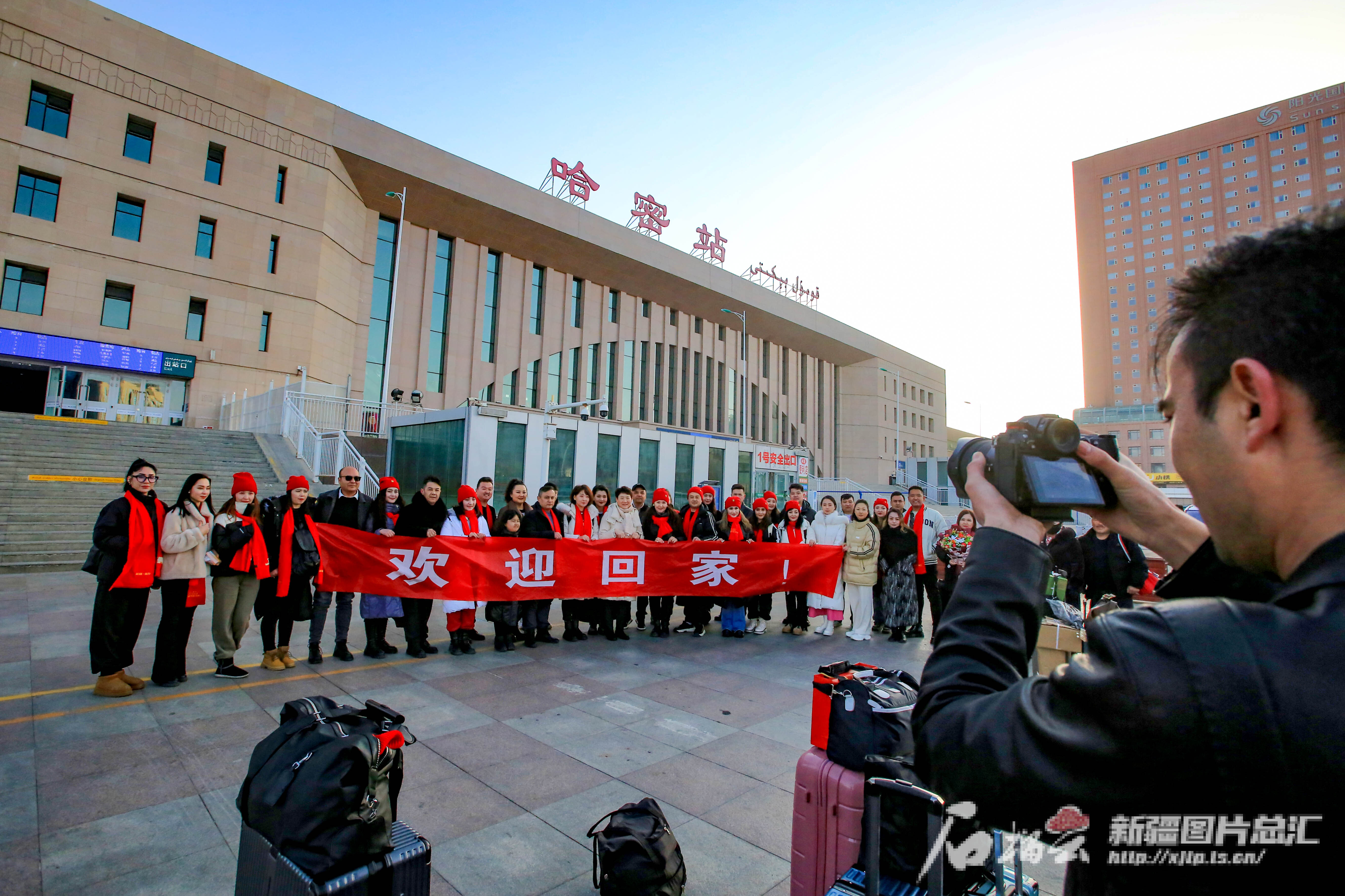 2月11日,参加中央广播电视总台《2024年春节联欢晚会》新疆喀什分会场演出的演员在哈密站合影留念。石榴云/新疆日报记者 蔡增乐 摄