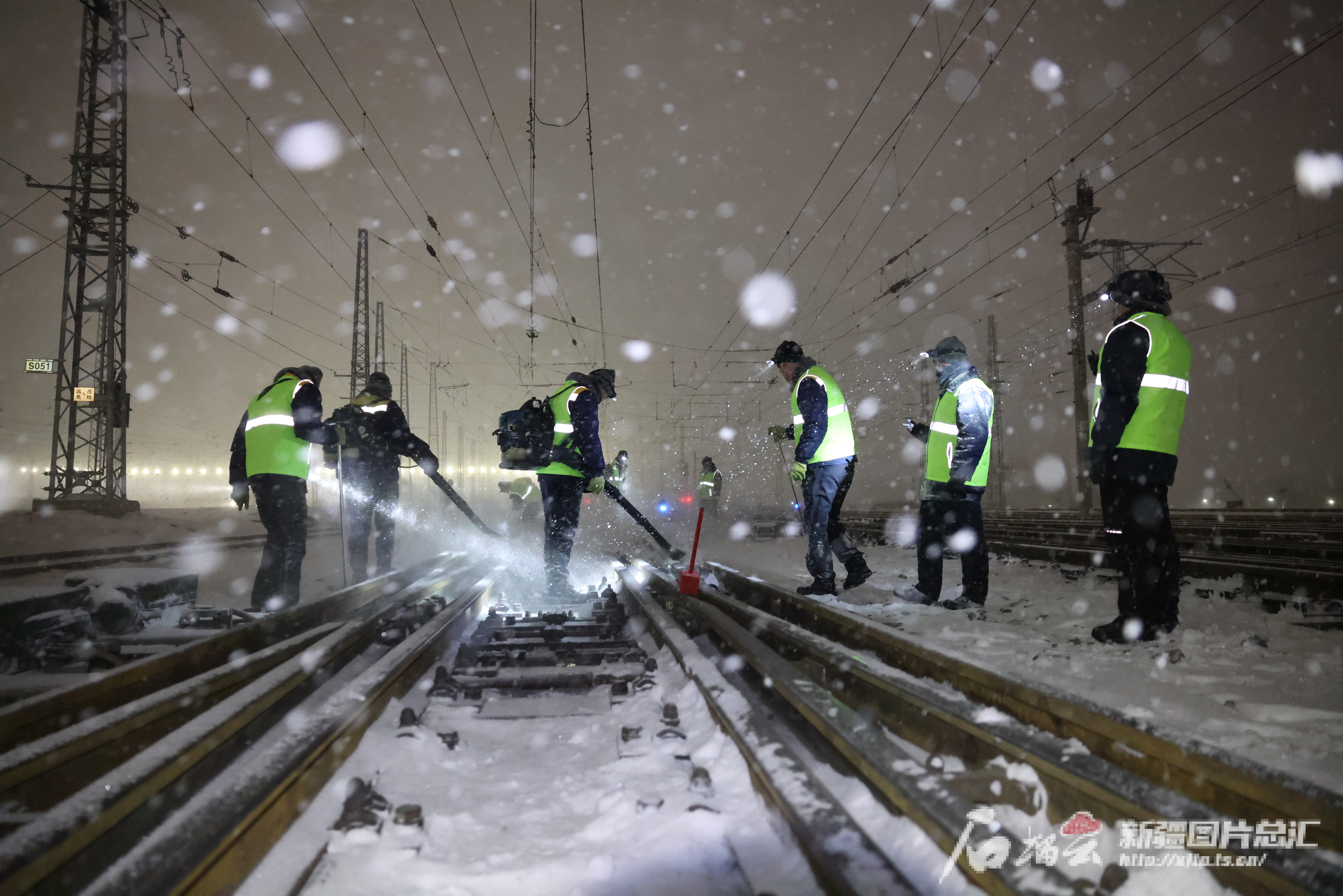 新疆铁路部门工作人员在连夜清除线路上的积雪。赵博川摄