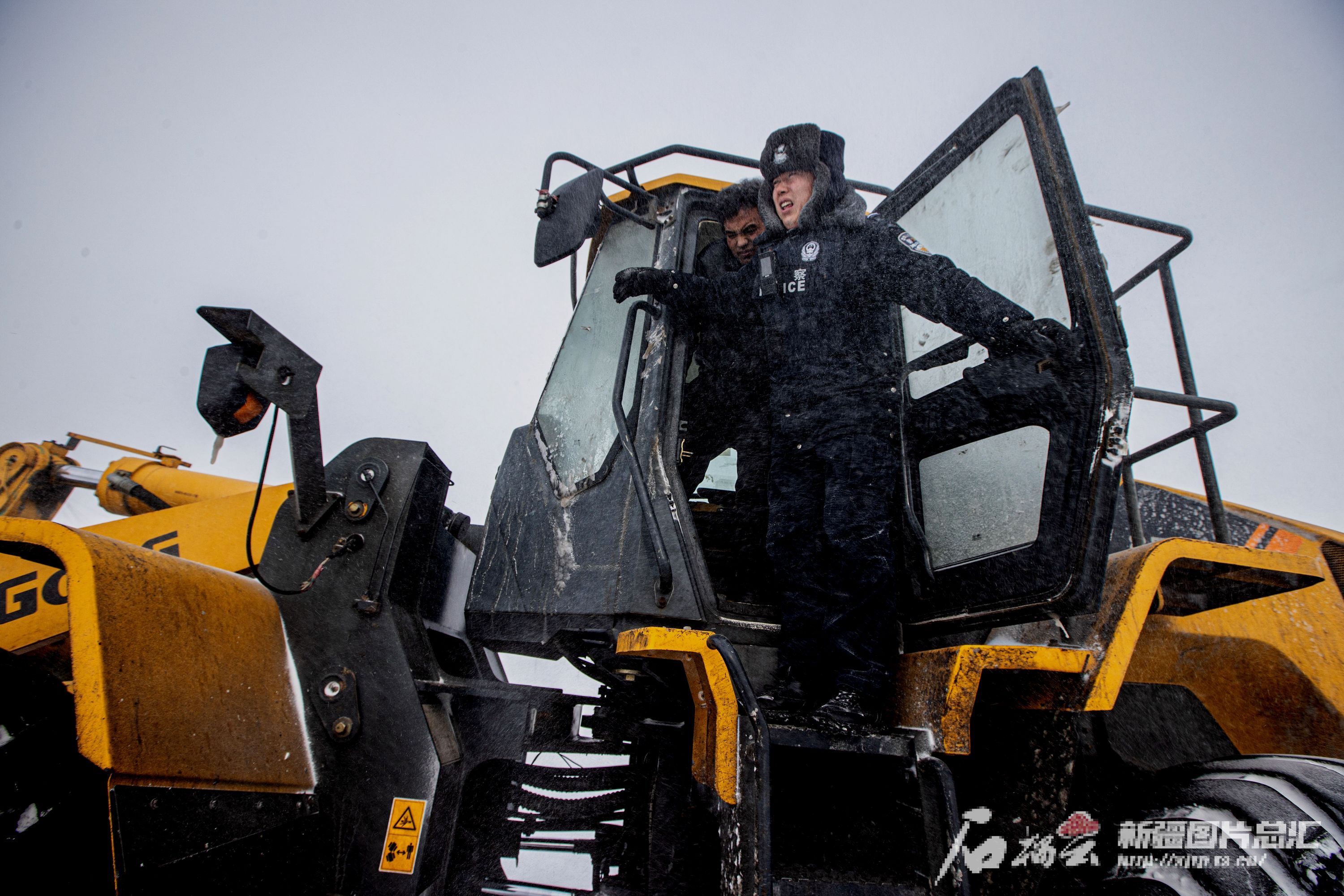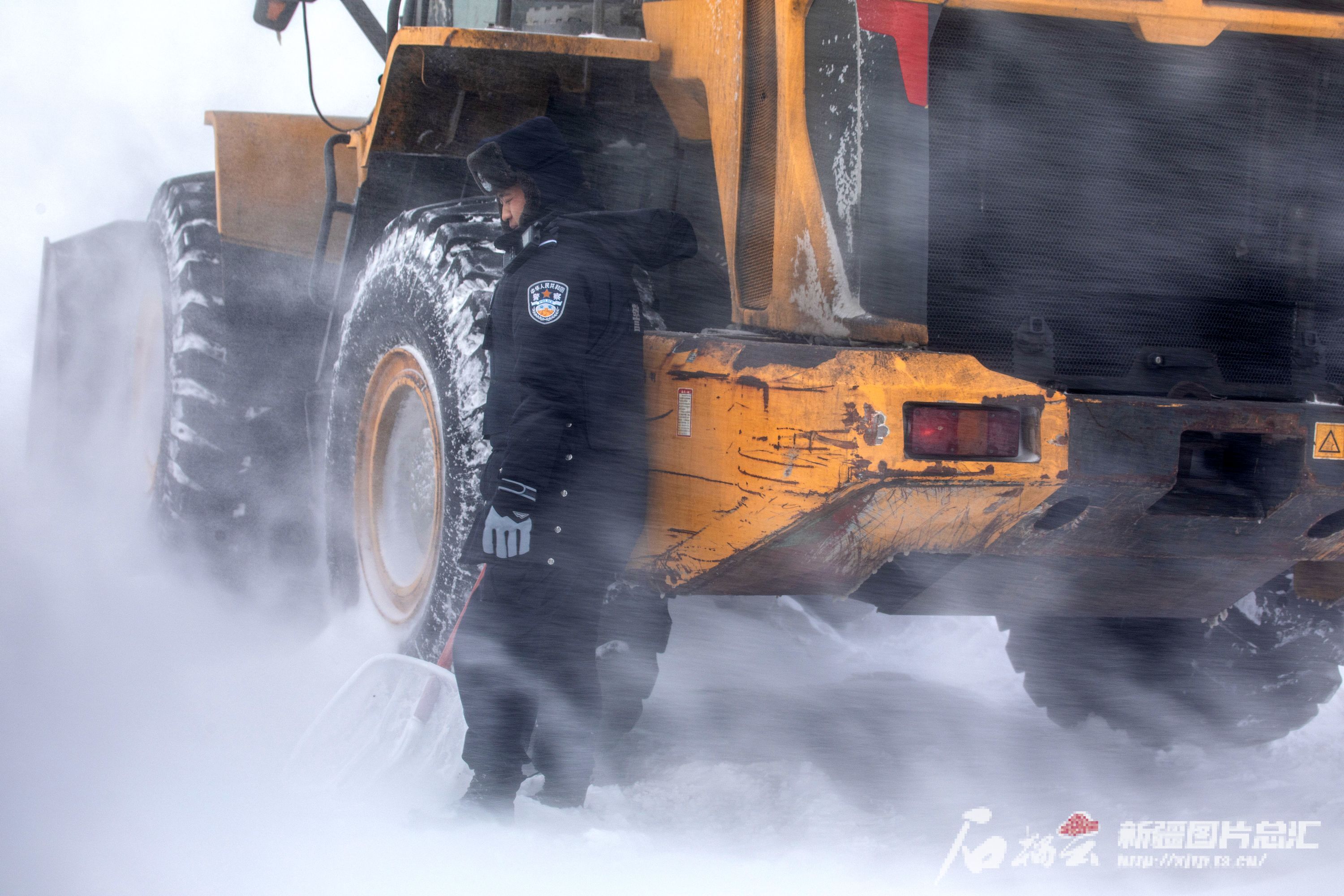 2月17日,民警调动铲车清理道路积雪。芦胜磊摄