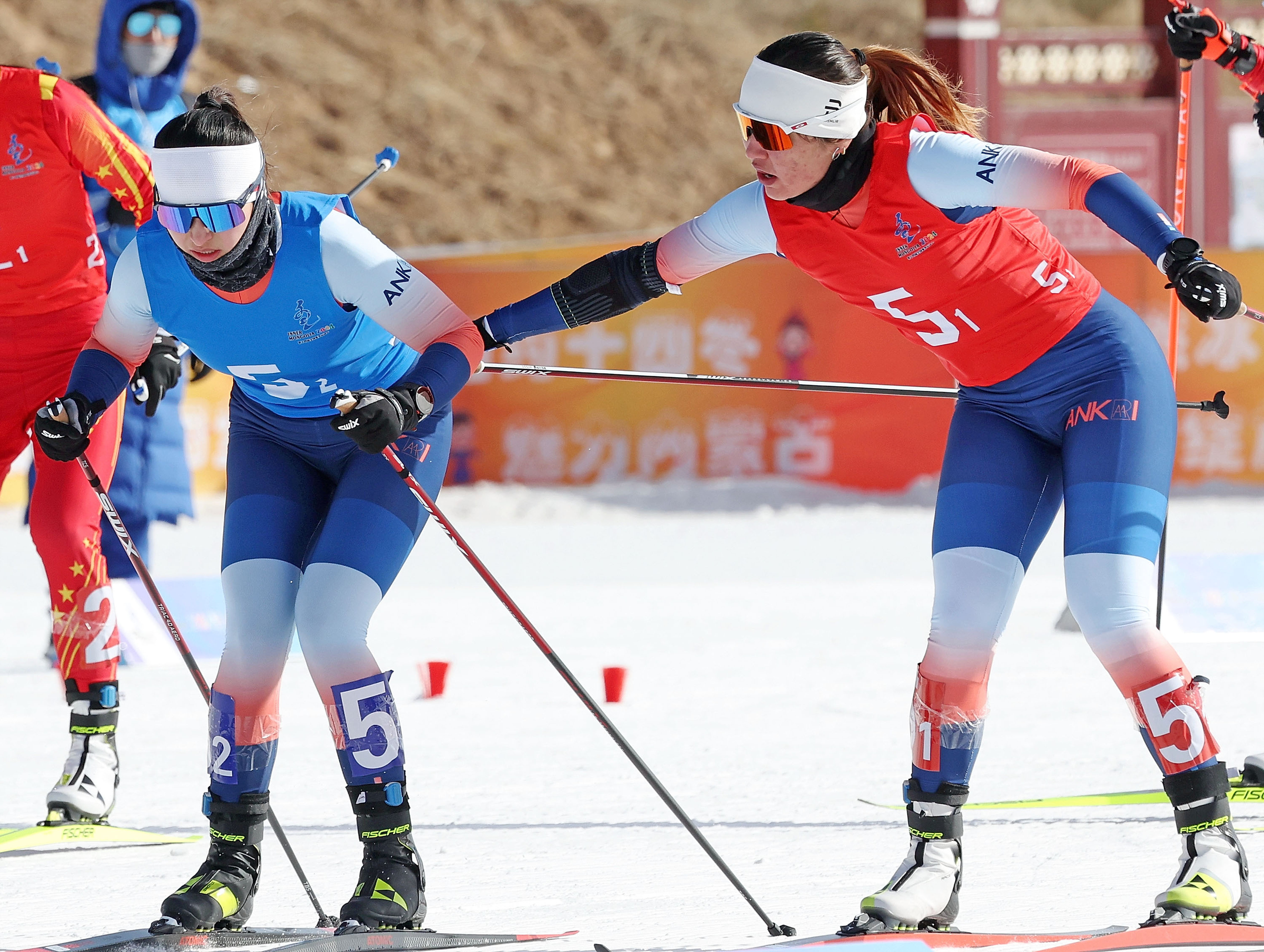 新疆队选手巴亚尼·加林(右)与队友迪妮格尔·衣拉木江在比赛中完成接力。赛事主办方供图