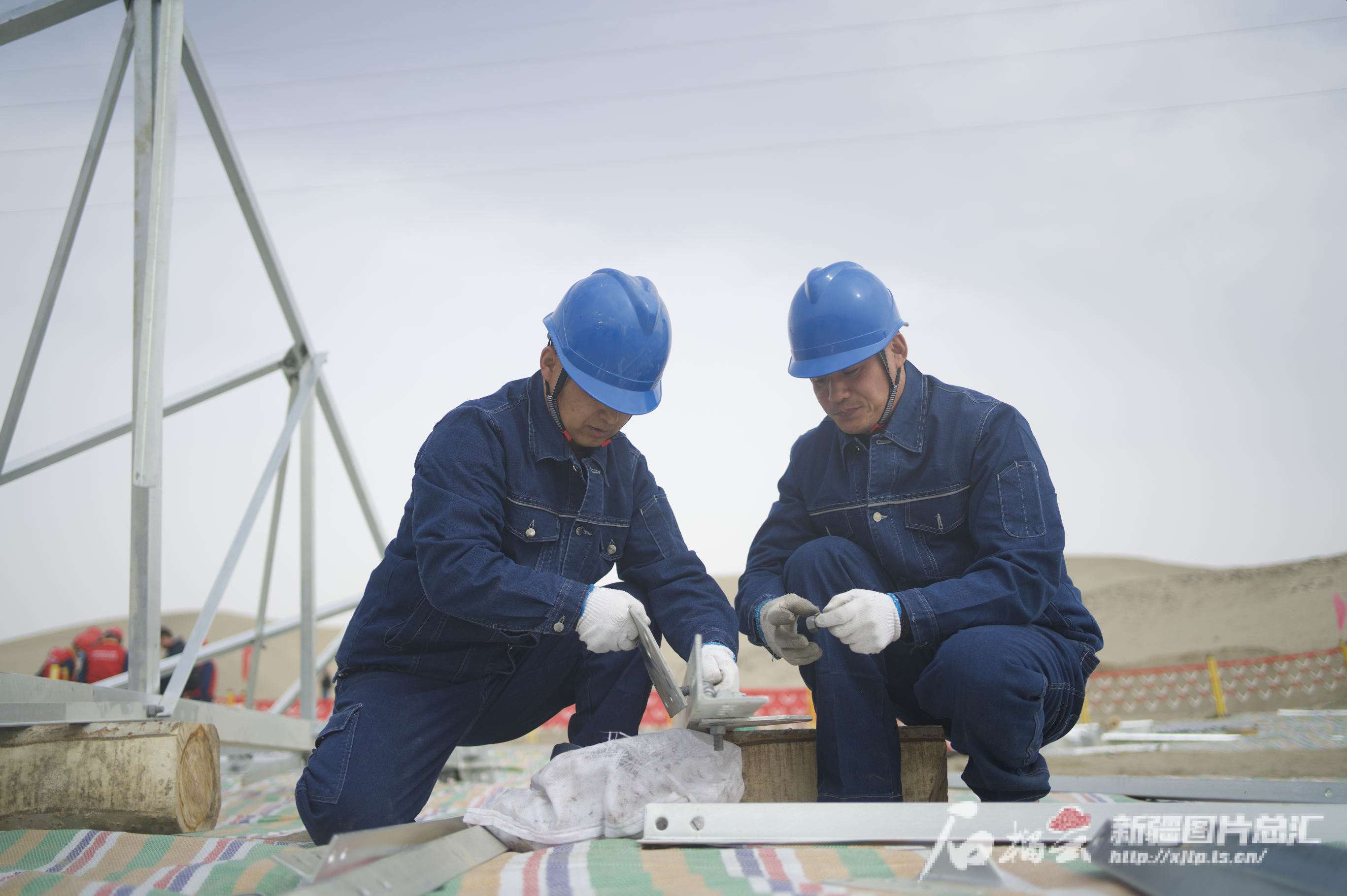 3月3日,在位于和田市吉亚乡的和田塔瓦库勒110千伏变电站二期扩建工程线路施工现场,施工人员正在组装电力塔件。石榴云/新疆日报记者 拍热扎提·阿不都 摄