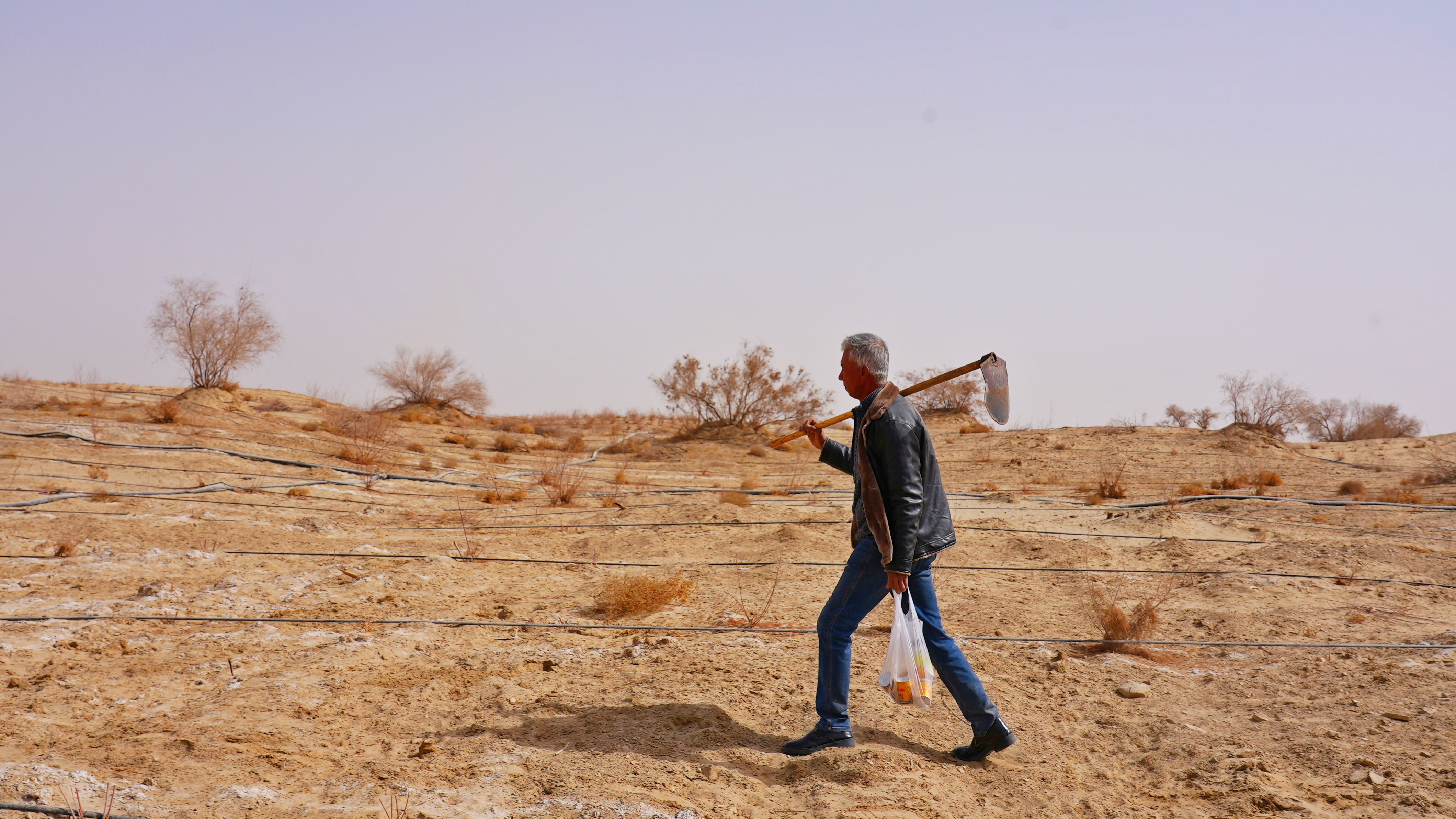 为了让记者有更直观的感受,图尔洪·买提塞地扛起坎土曼,一手提上一件矿泉水,一手提着从妻子手中接过的水果和馕,带着记者一起前往种植红柳的沙漠。
