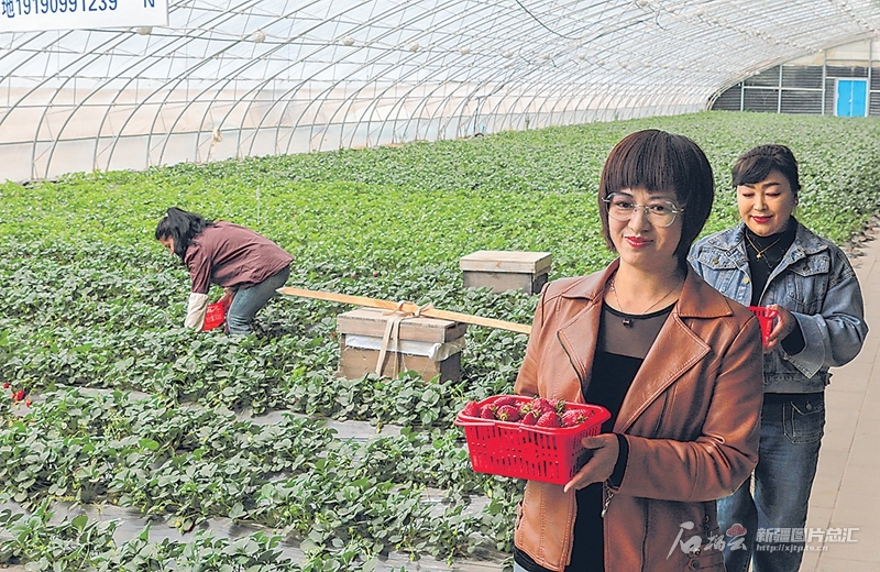 3月28日,游客在和田市古江巴格乡托万特根拉村乡情园农业采摘基地采摘草莓。三月,春暖花开,很多游客来到这里体验采摘乐趣。许晓龙摄