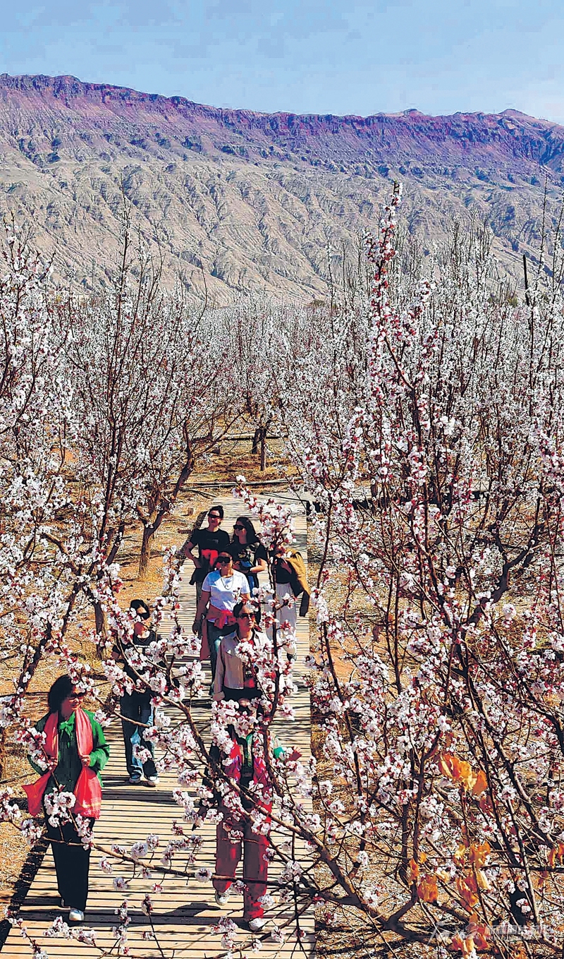 3月26日,游客在火焰山下的一处杏花园游览。眼下,吐鲁番数万亩杏花竞相绽放,引得游客纷至沓来。刘健摄