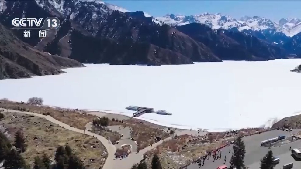 草木春色+冰封湖面 这种“反差美”可以在天山天池尽收眼底
