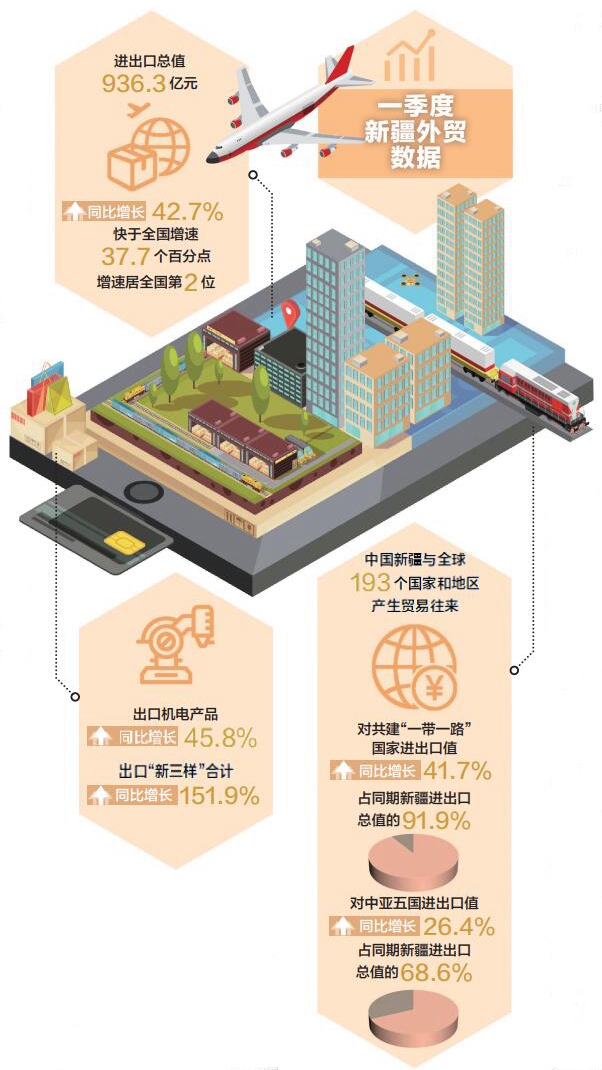 一季度,新疆外贸进出口总值936.3亿元,同比增长42.7%,高出全国增速37.7个百分点,增速居全国第2位。这组数据清晰表明新疆外贸活力正在迸发,规模逐步扩大。