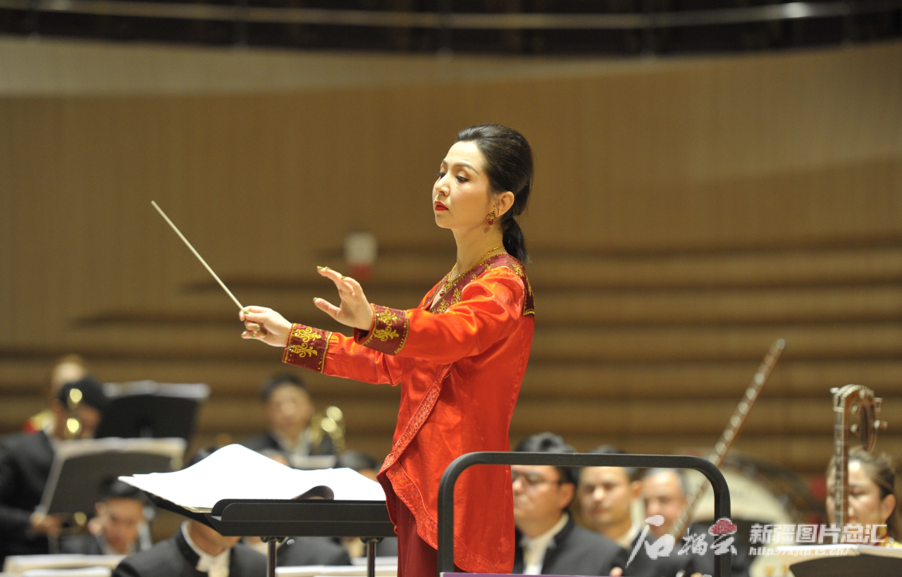 努尔巴纳·依明在指挥乐队演奏民族管弦乐《音乐铺就的丝绸之路》。