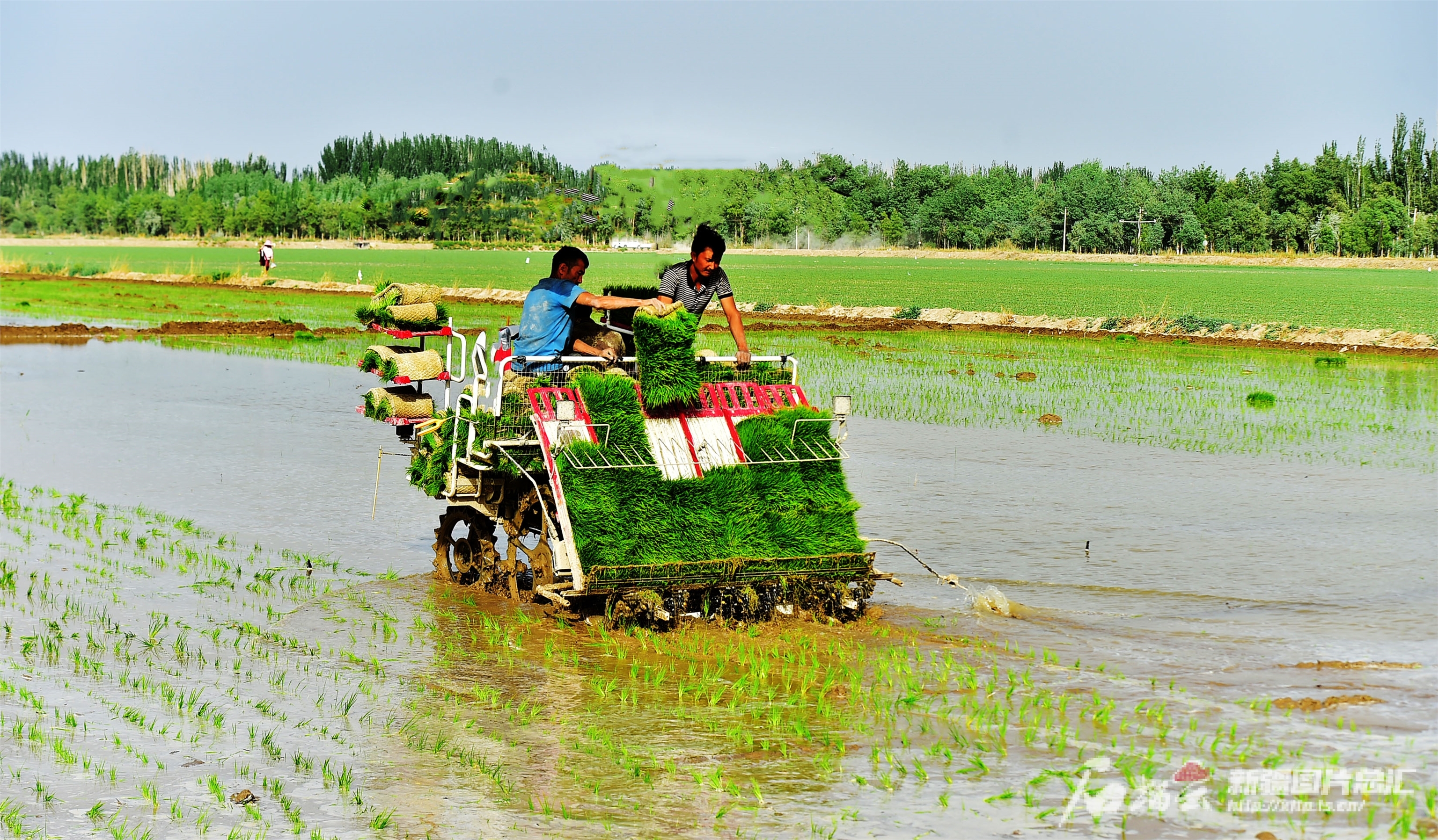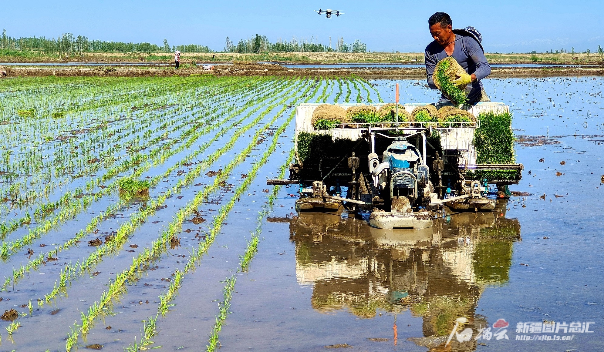 眼下正是水稻插秧好时节,在察布查尔锡伯自治县察布查尔镇安定村,一块块水田波光潋滟,稻农正忙着驾驶水稻插秧机在稻田里插秧,该村今年种植水稻1068亩。