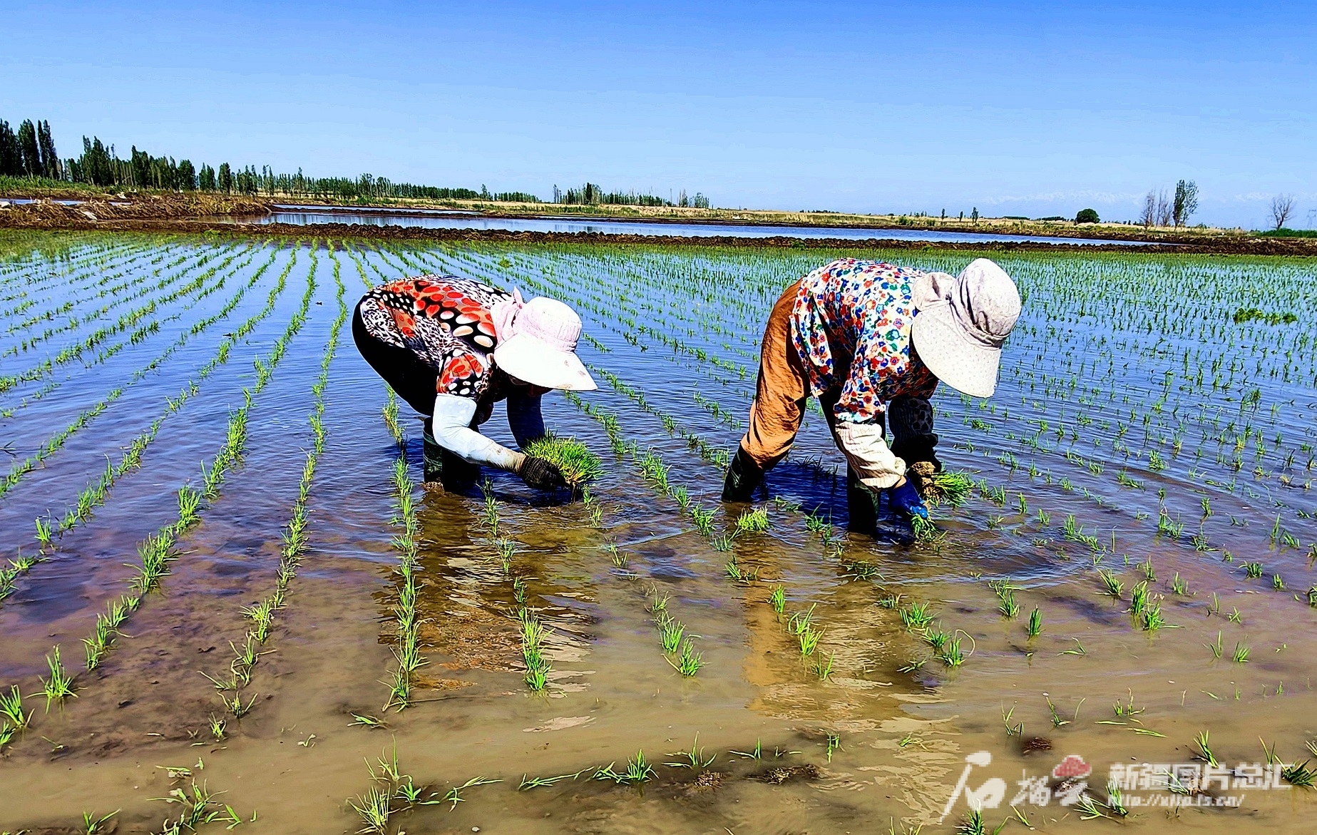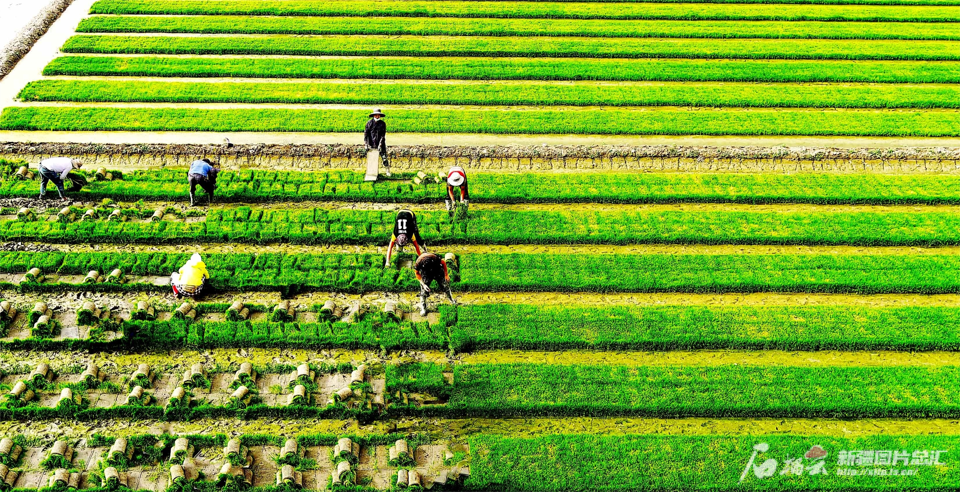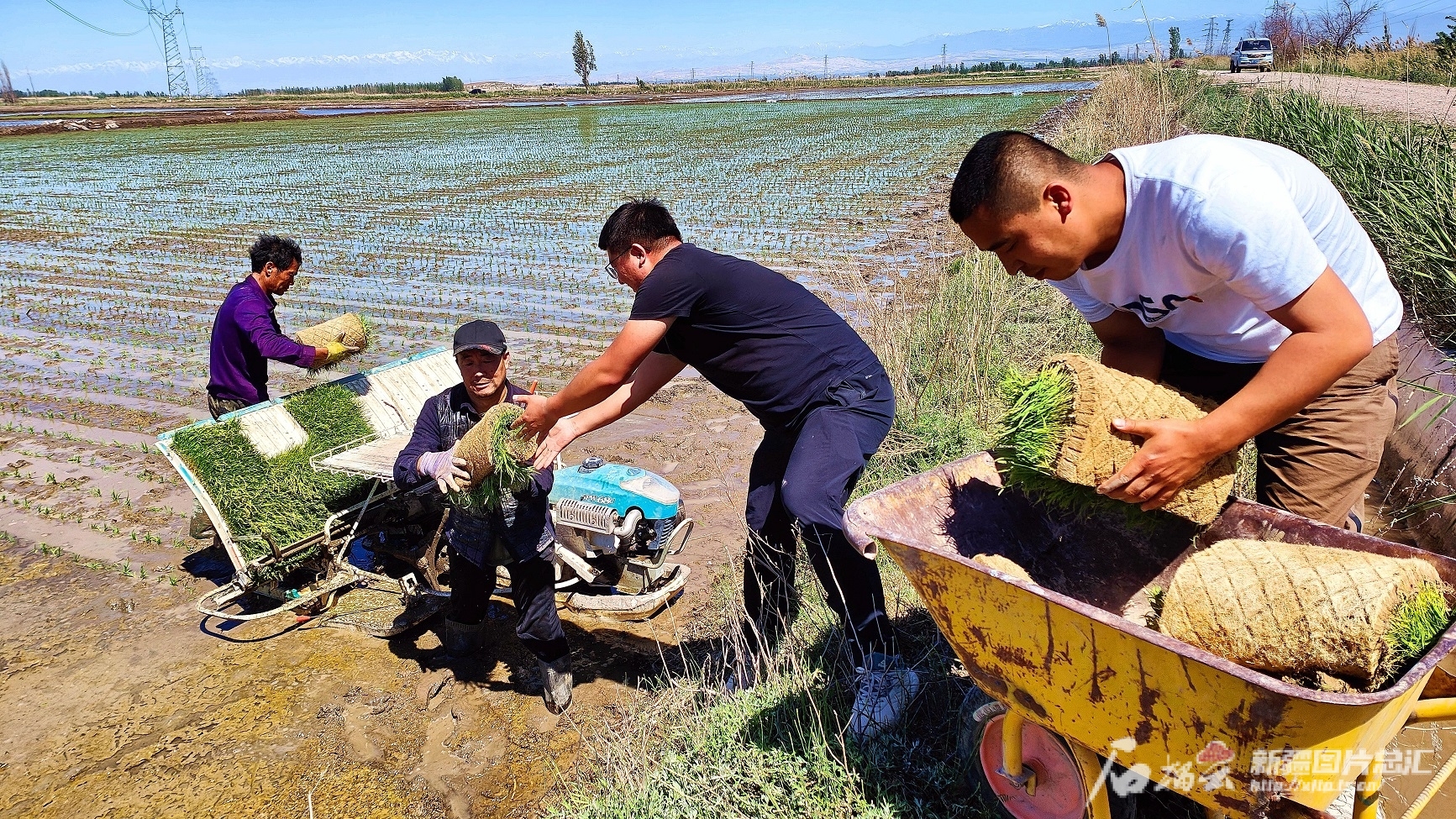 5月12日,兵团第一师16团职工在高标准农田里卷秧苗。孙国权摄