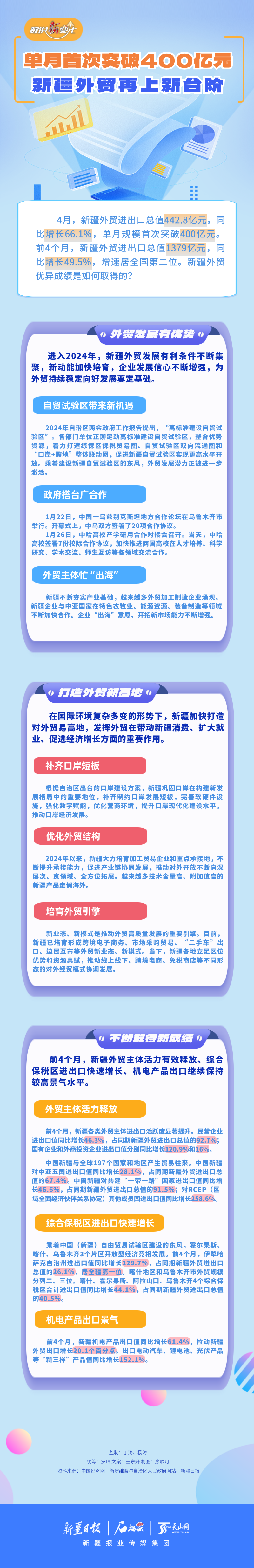 今年4月,新疆外贸进出口单月首次突破400亿元。前4个月,新疆外贸进出口增速居全国第二位。在国际环境复杂多变的形势下,新疆外贸为何能一次次取得优异成绩?今天的《数说“新”变化》带你一图了解。