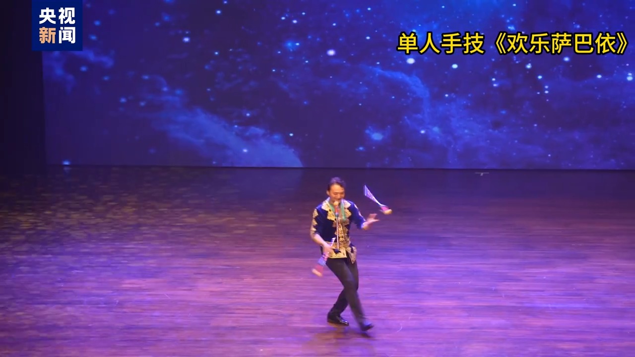 新疆艺术剧院杂技团演员艾克拜尔·阿不都热衣木自5岁开始学杂技,至今已坚持26年。晚会上他表演的单人手技《欢乐萨巴依》,利用手技表演杰克棒的形式,结合新疆本土乐器萨巴依,通过对传、各种花抛等技艺表演,险中求稳,动中求静,带给现场观众耳目一新的视觉享受。
