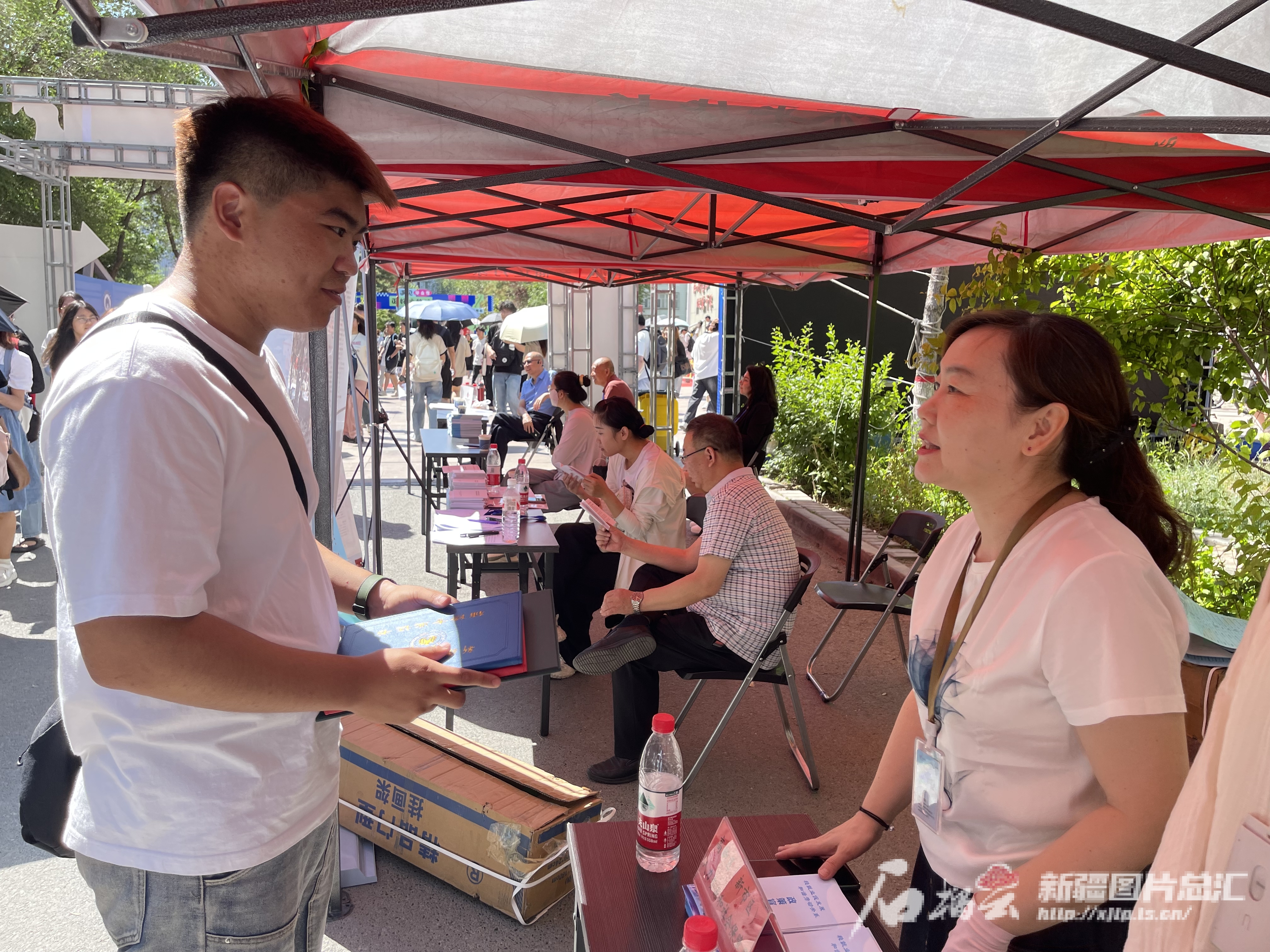 6月12日,新疆财经大学就业(实习)招聘会上,乌鲁木齐高新技术产业开发区(新市区)人力资源和社会保障局就业服务管理中心工作人员向2024届毕业生介绍高校毕业生就业创业政策。赵西娅摄