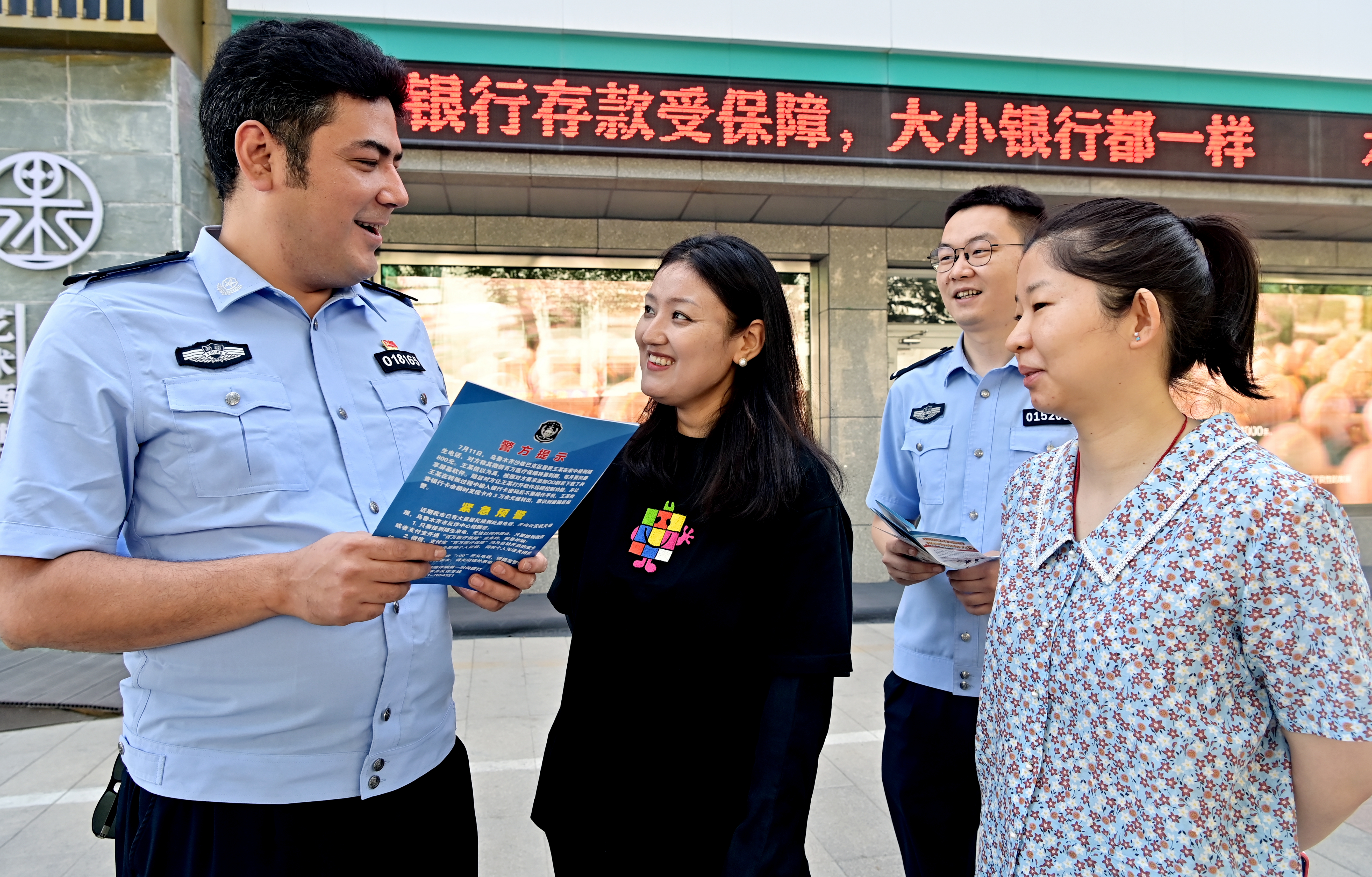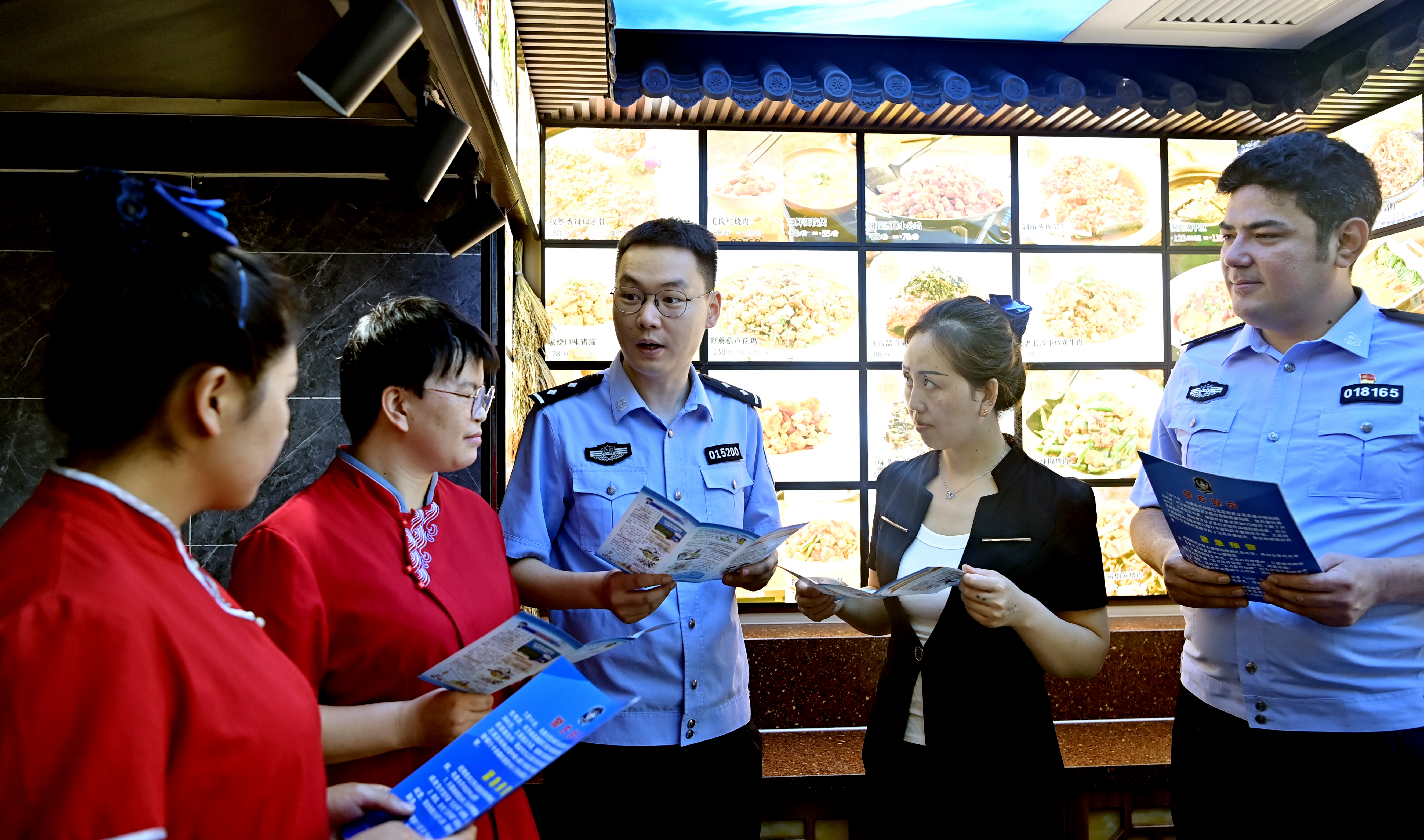 6月15日,乌鲁木齐市公安局沙依巴克区分局扬子江路派出所联合乌鲁木齐市公安局沙依巴克区分局经济犯罪侦查大队,组织警力深入辖区商铺、餐饮企业等,开展防范非法集资宣传活动。石榴云/新疆法治报记者 单坤摄