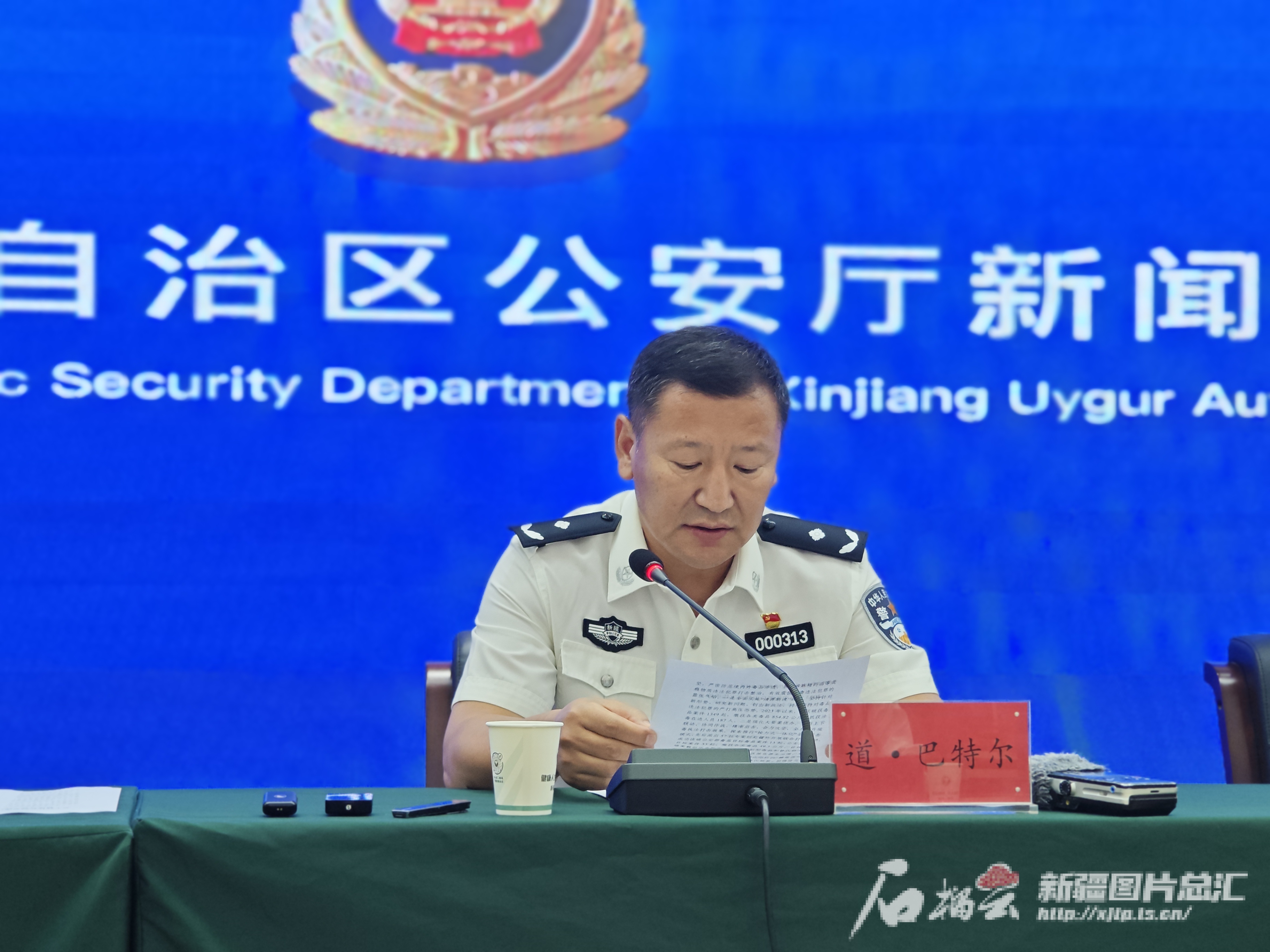 6月25日,自治区公安厅举行新闻通气会,自治区公安厅禁毒总队总队长道·巴特尔向媒体介绍2023年以来新疆公安禁毒工作取得的成效。石榴云/新疆日报记者 隋云雁摄