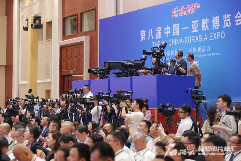 6月26日上午,第八届中国—亚欧博览会开幕,媒体记者在工作。石榴云/新疆日报记者 李杨摄
