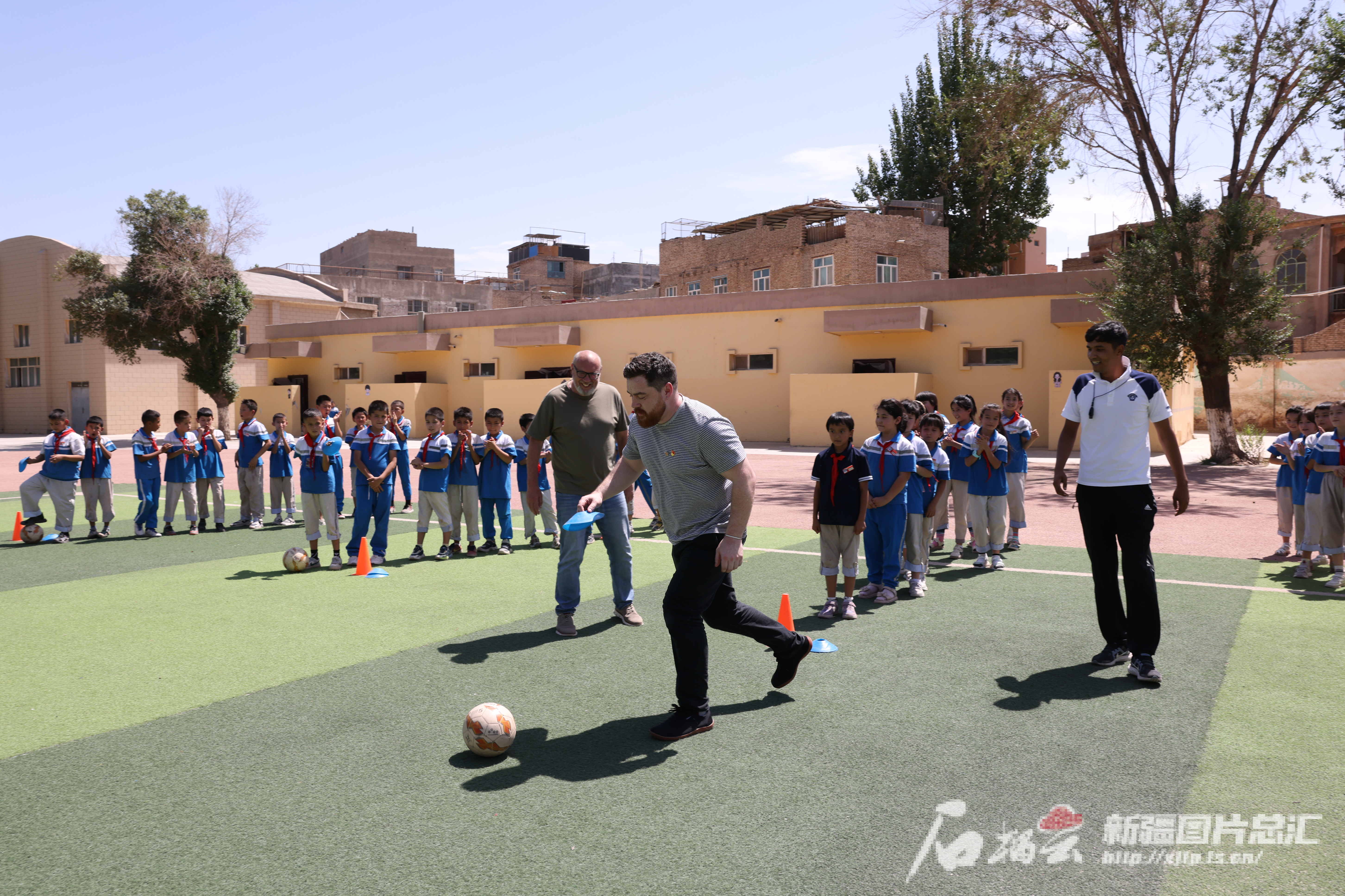 在喀什市第十一小学,代表团观摩了学生们上课。在音乐课和操场上,他们与学生们一同欢快舞蹈,并加入到学生足球队的训练中,展示了不俗的球技。“可以看出孩子们非常喜欢校园生活,眼中流露着幸福的光芒。”代表团成员说。