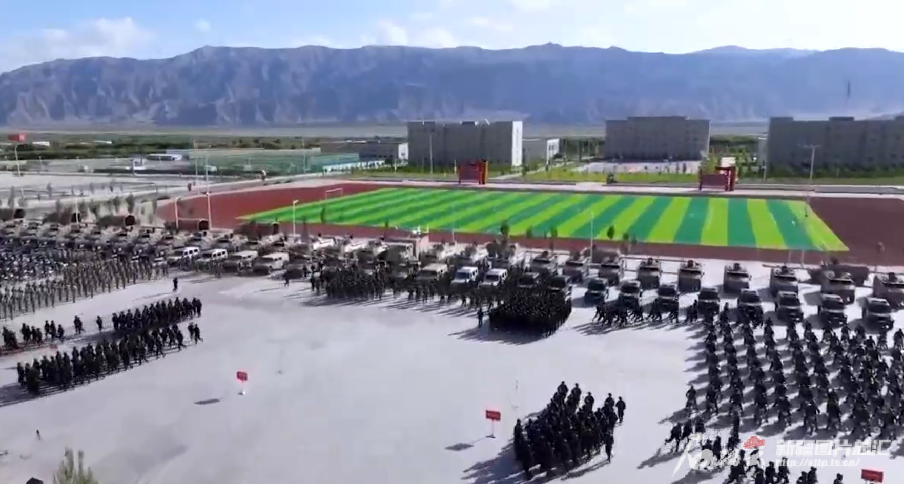 武装拉动演训在南疆某地举行。新疆军区、武警、边检、公安、新疆生产建设兵团民兵等各方力量组成共3000人的演训队伍,出动直升机、无人机和装甲车、突击车等各类车辆,机动集结,严阵以待。