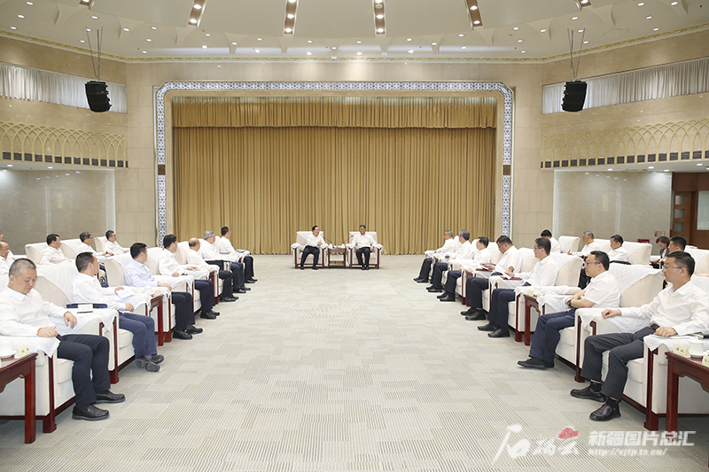 7月4日至6日,浙江省代表团来新疆考察对接对口支援工作。这是7月5日,自治区党委书记马兴瑞,自治区党委副书记、自治区主席艾尔肯·吐尼亚孜在乌鲁木齐会见浙江省委副书记、省长王浩及代表团成员。天山网-新疆日报记者 崔志坚摄