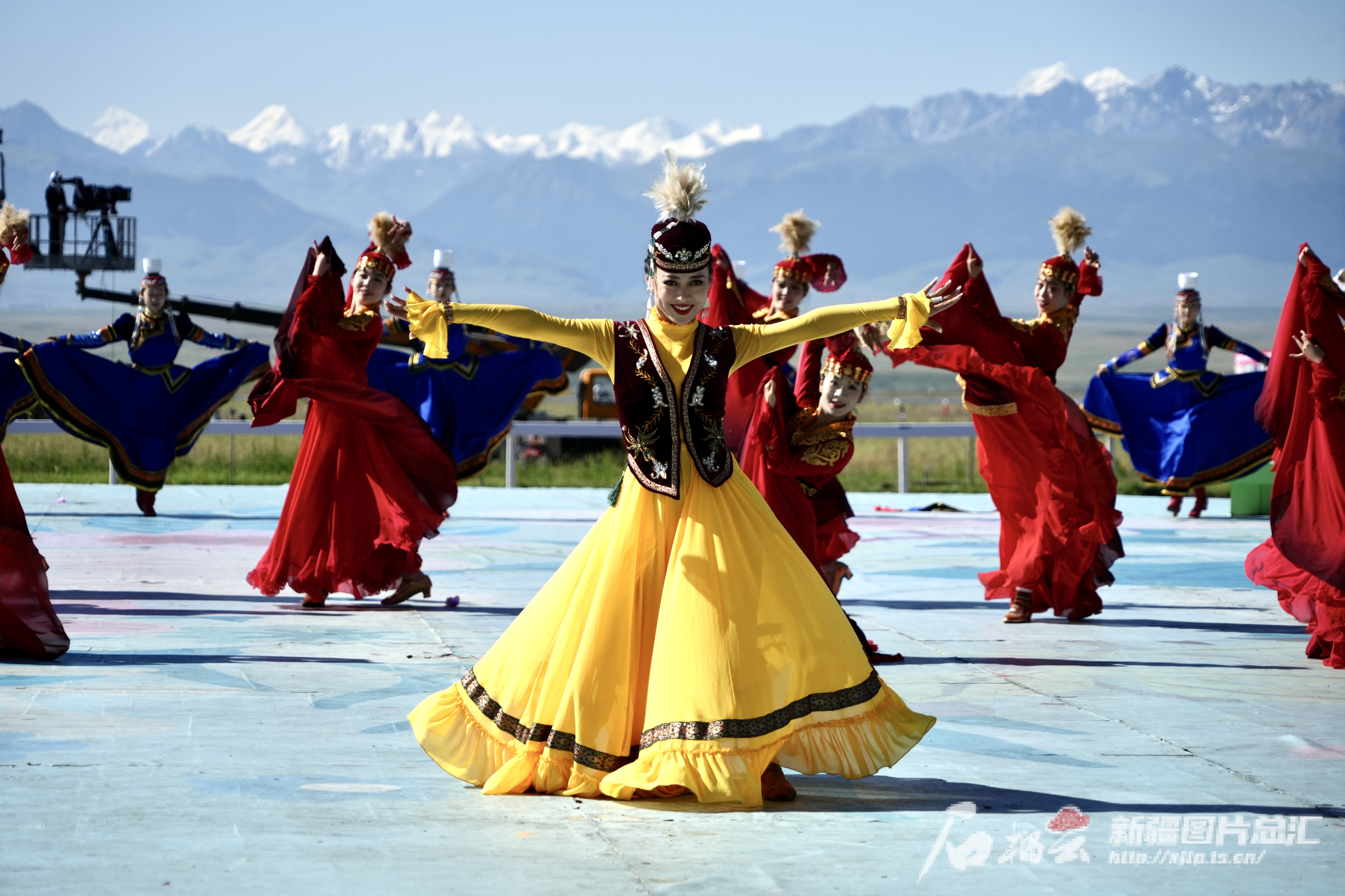 12时许,随着一声声粉红色礼炮升上天空,以“石榴花盛开 筑梦新时代”为主题的文艺演出开始。上篇“幸福欢歌”中,60位身着马服的鼓手推着“天马鼓”走上舞台,绕鼓欢快起舞。他们身后的蓝天、白云、草原,在振奋人心的鼓点中渲染得分外好看。马场上,来自昭苏县天马旅游文化园的马术演员骑着10匹汗血宝马献上一场精彩的马术表演。天山脚下,各族同胞欢歌妙舞,一派团结和谐的场面。江南柔美的舞姿加上刚劲的“黑走马”,帅气的库姆孜加上柔美的顶碗舞,台上台下都在礼赞“新疆是个好地方”。