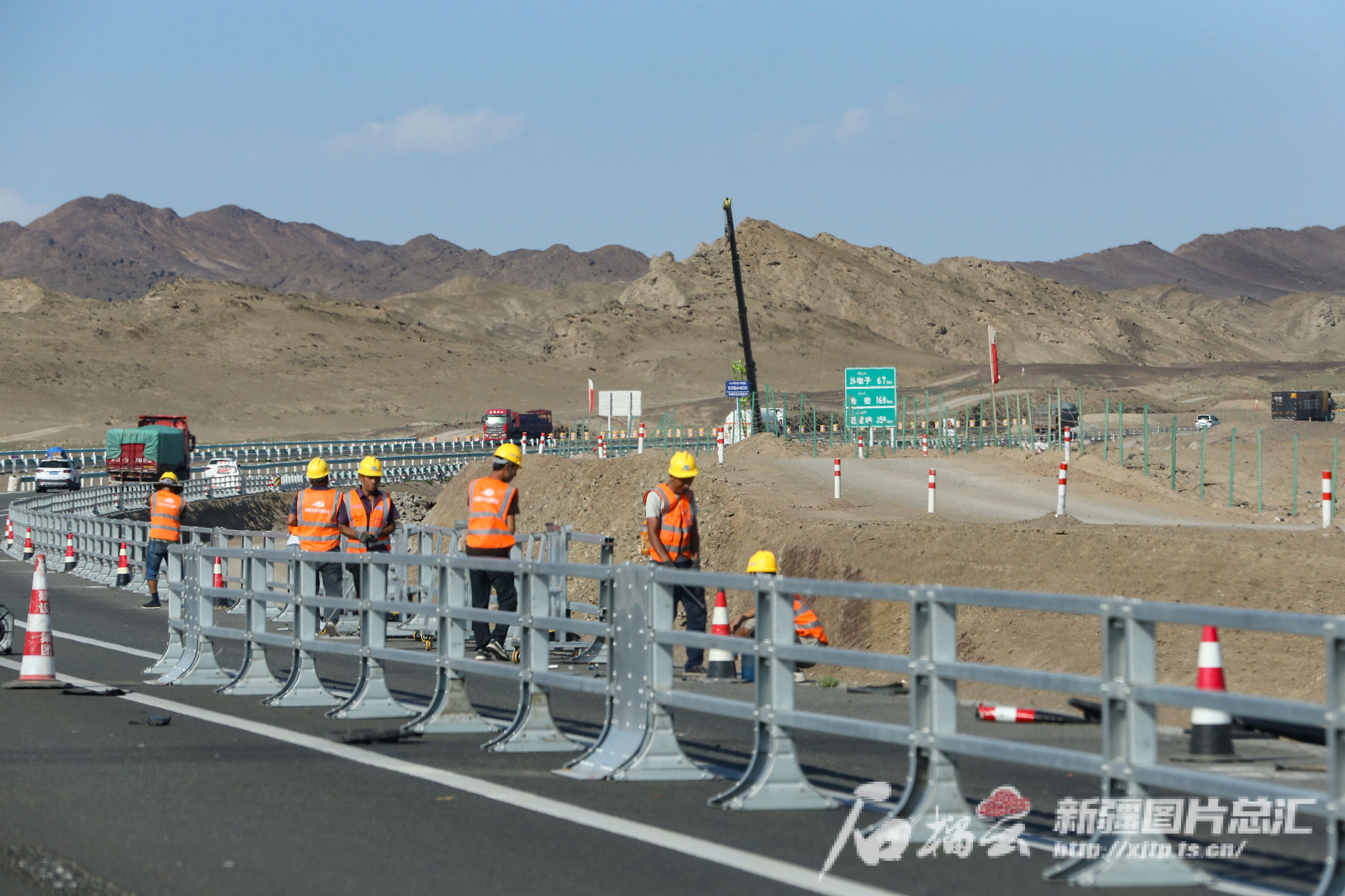 7月30日,工人在G30连霍高速公路哈密至吐峪沟段改扩建工程哈密段安装护栏。