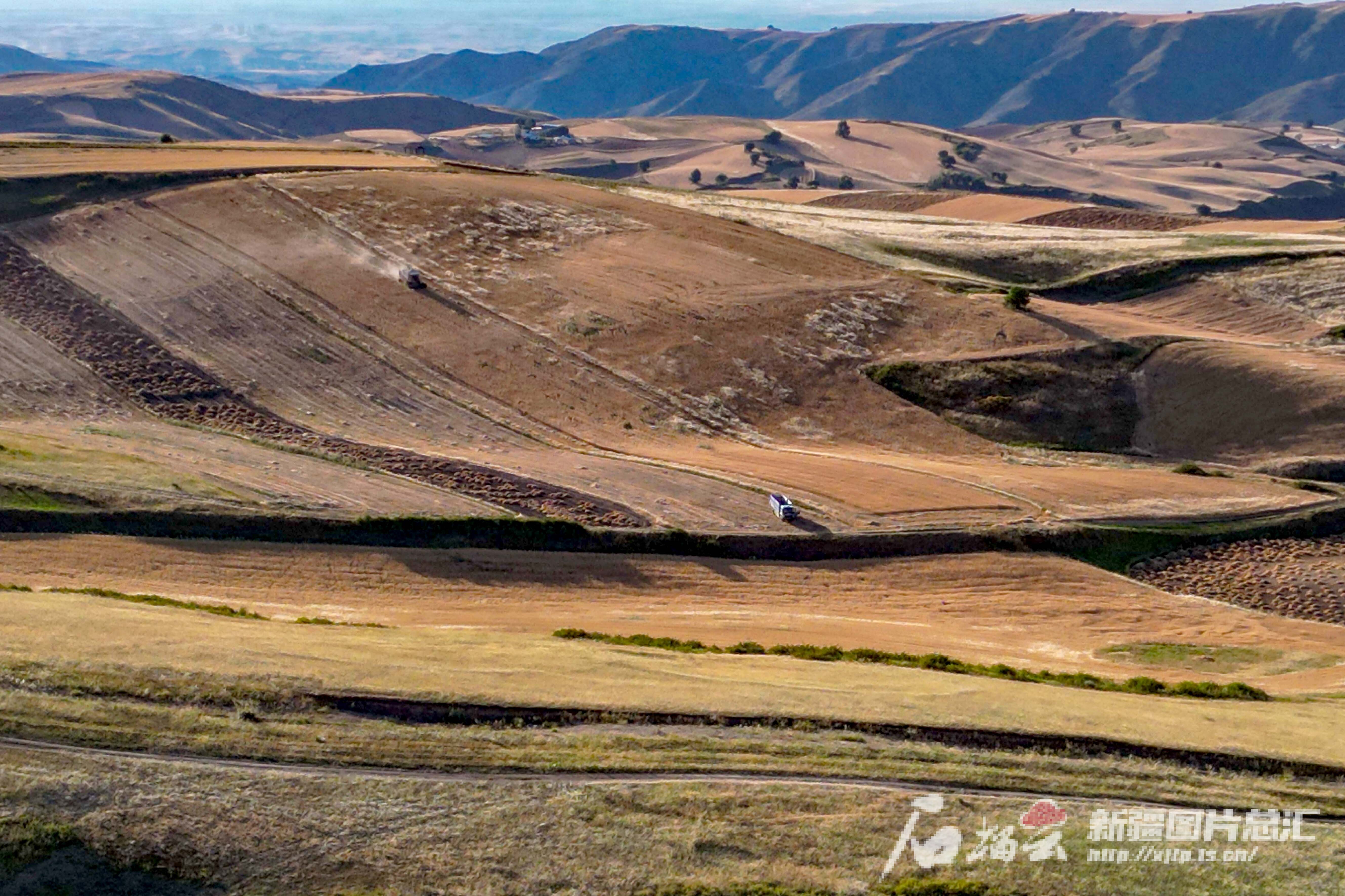 8月1日,收割机在木垒哈萨克自治县照壁山乡平顶山村成熟的麦田里收获小麦(无人机摄)。