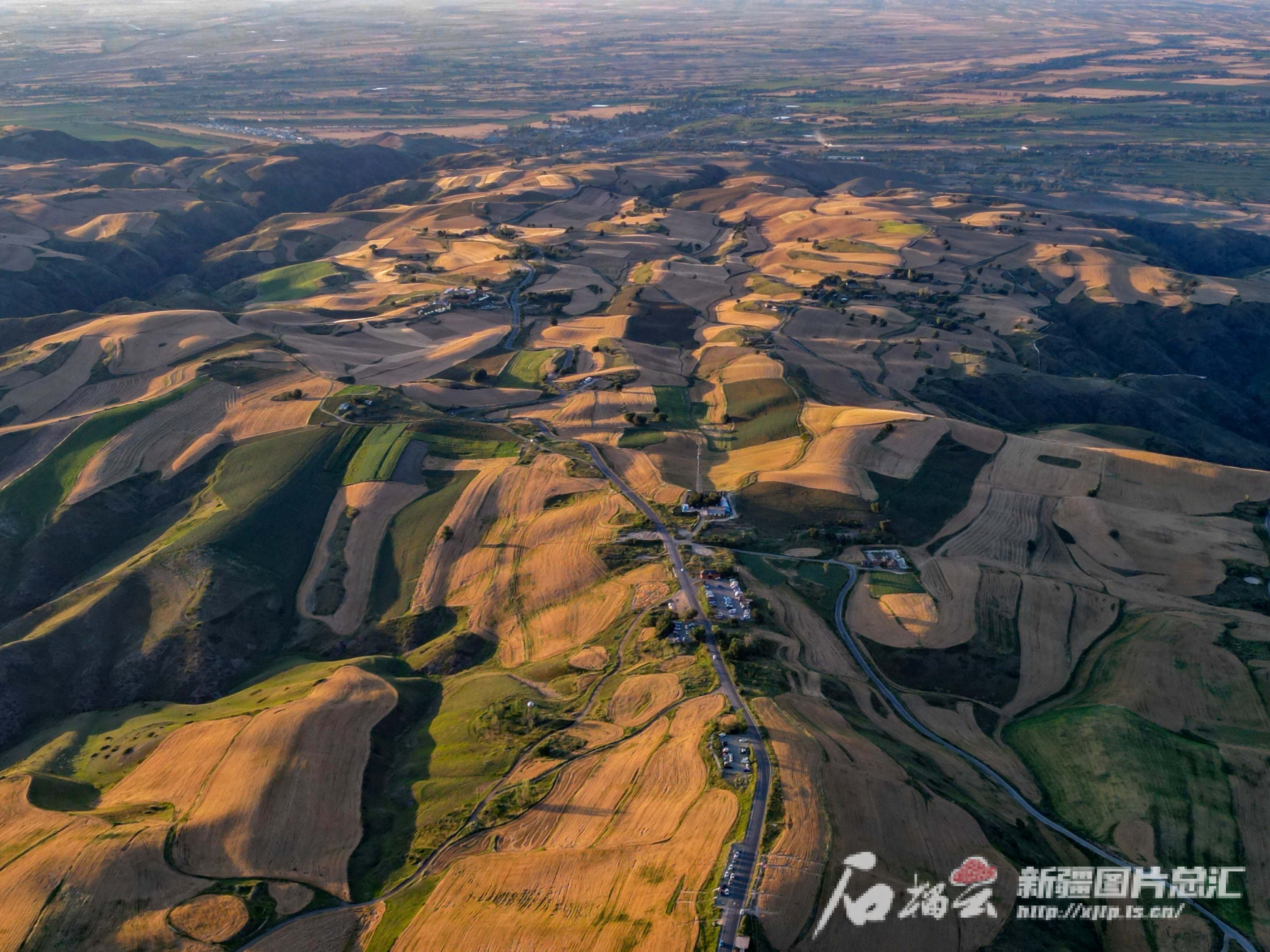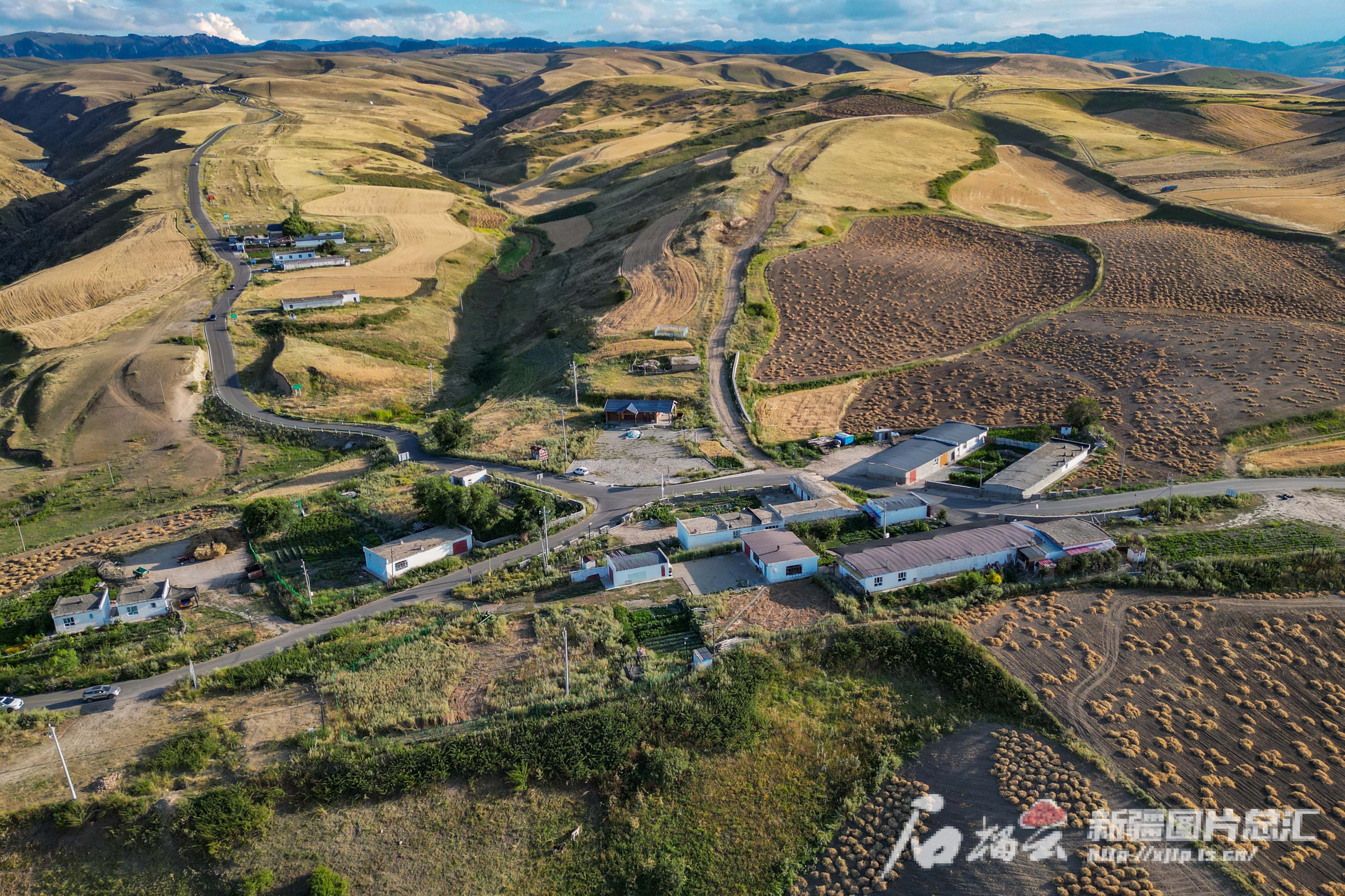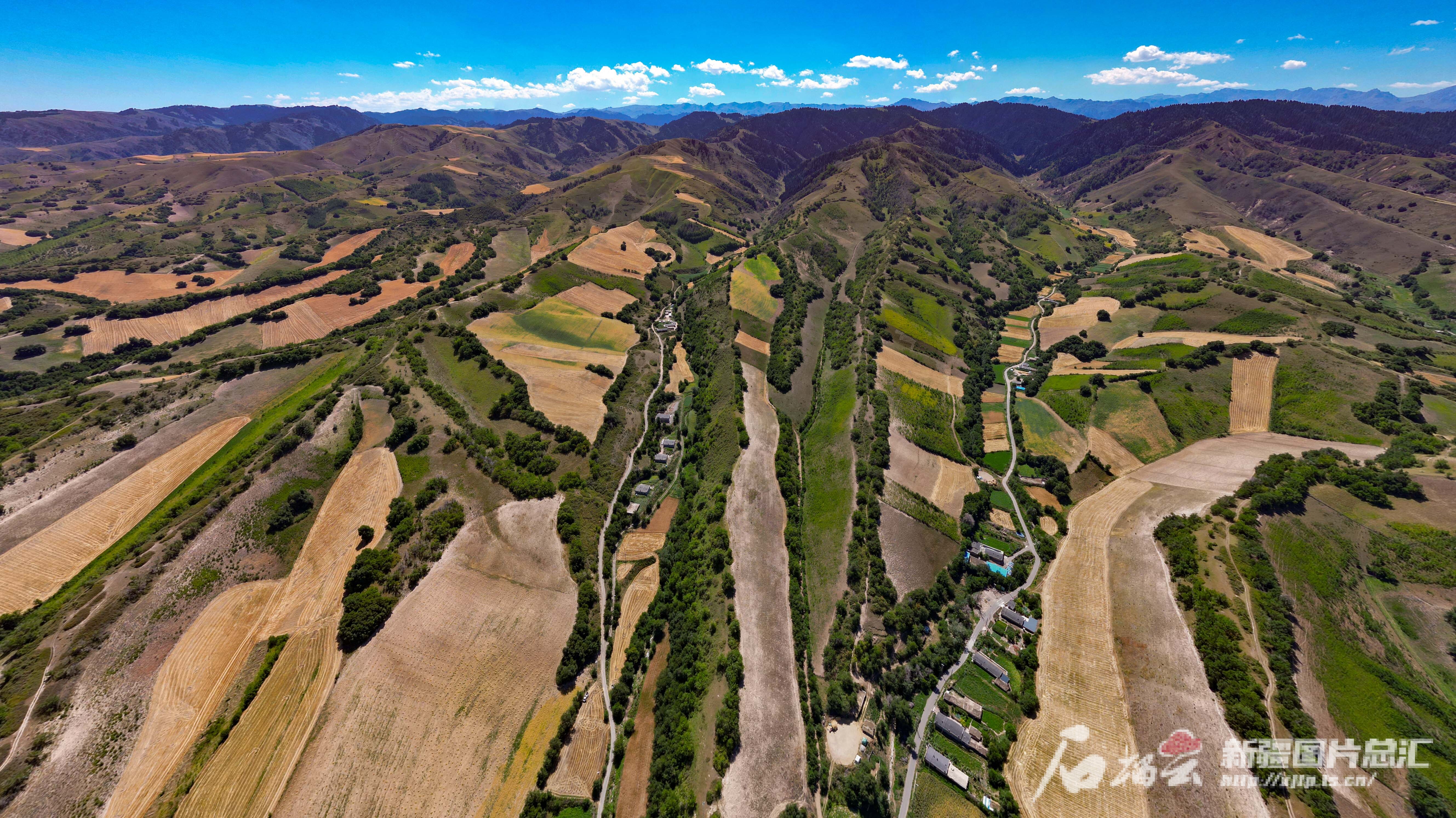 8月2日在木垒哈萨克自治县英格堡乡庙尔沟村拍摄的田野景色(无人机摄)。