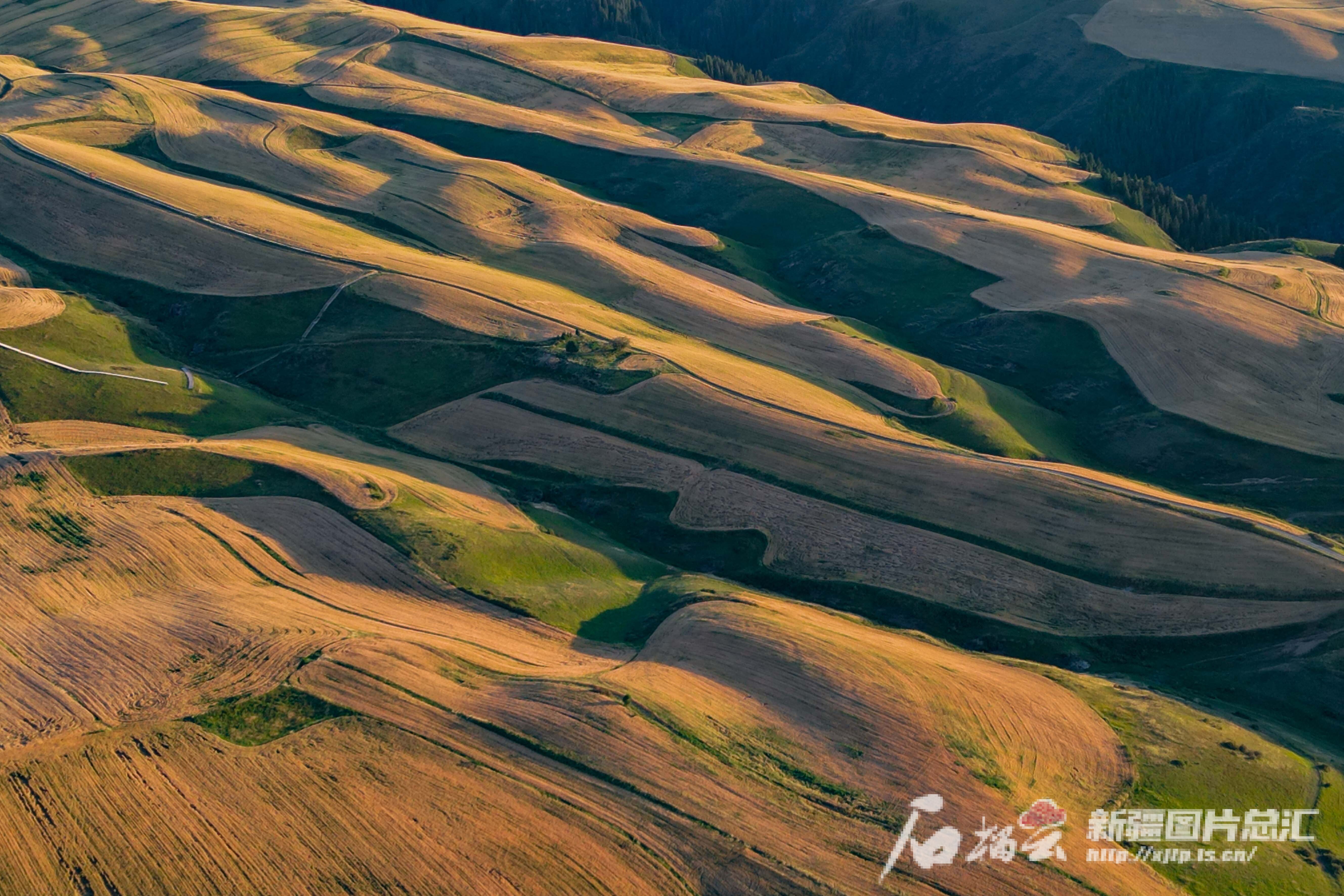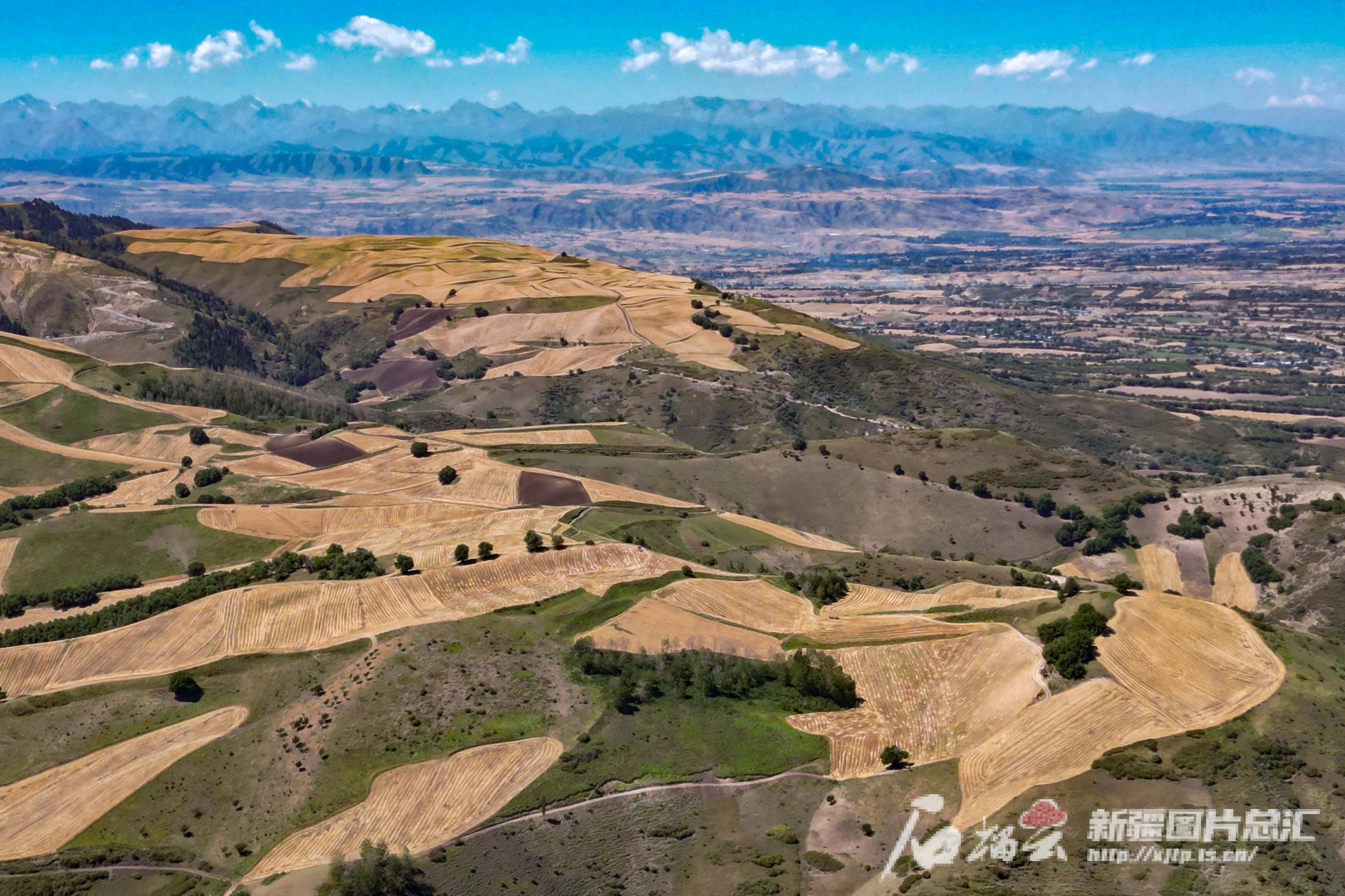 天山网-新疆日报讯(记者蔡增乐摄影报道)盛夏时节,通过无人机视角俯瞰大地,天山北部广袤的田野涂上了丰收的底色,金黄的麦田、黄绿相间的油菜田、翠绿的草地相映成景。田间地头机声隆隆,收割机在成熟的麦田中来回穿梭,呈现出一派丰收的景象。