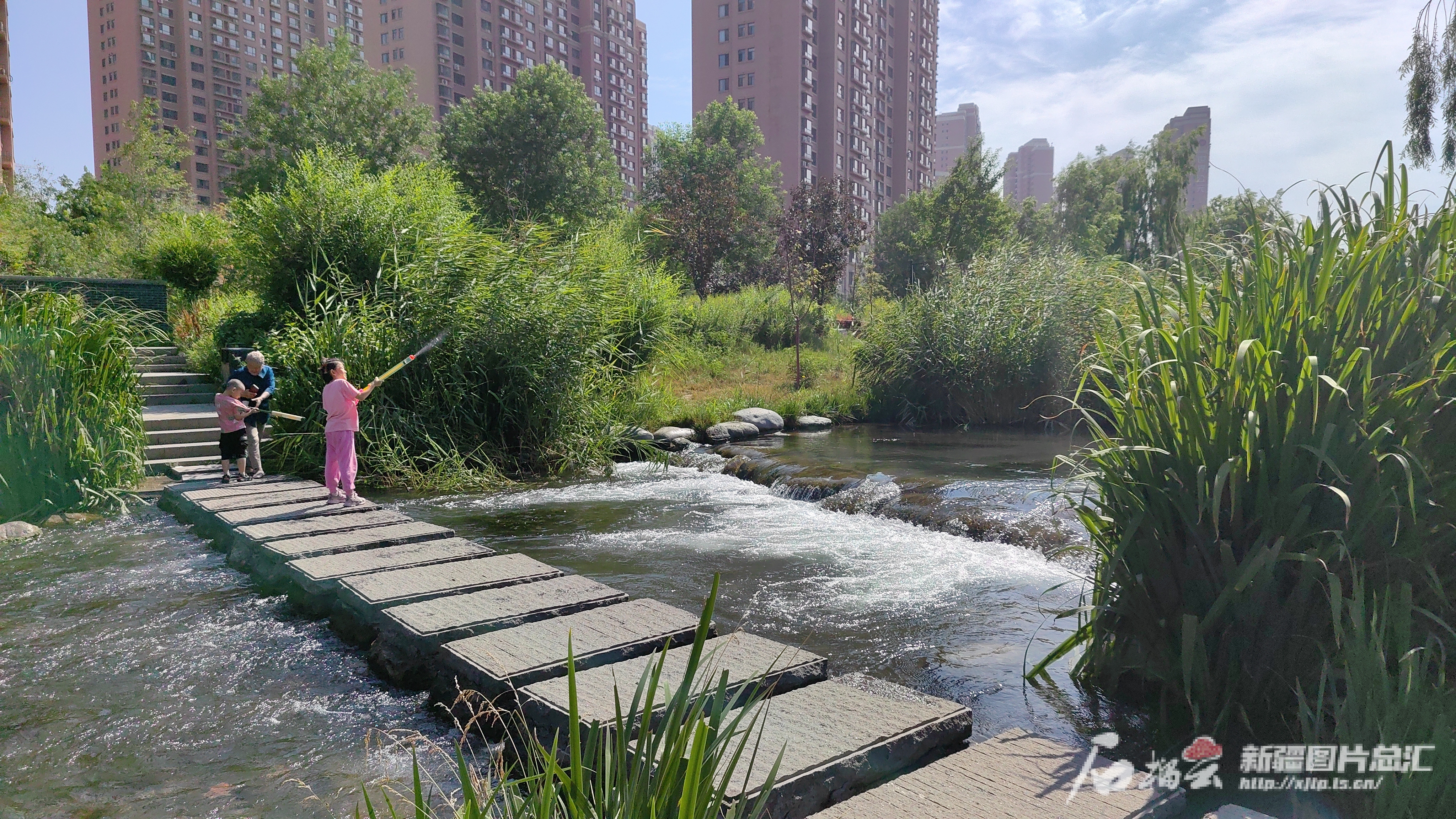 7月20日,水磨河周边居民带着孩子在岸边玩耍。石榴云/新疆日报记者李行摄