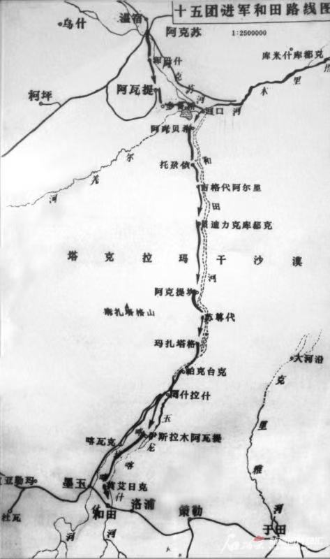 解放军穿越塔克拉玛干沙漠进军和田地图,麻扎塔格(红白山)是关键一站。新疆生产建设兵团军垦博物馆提供
