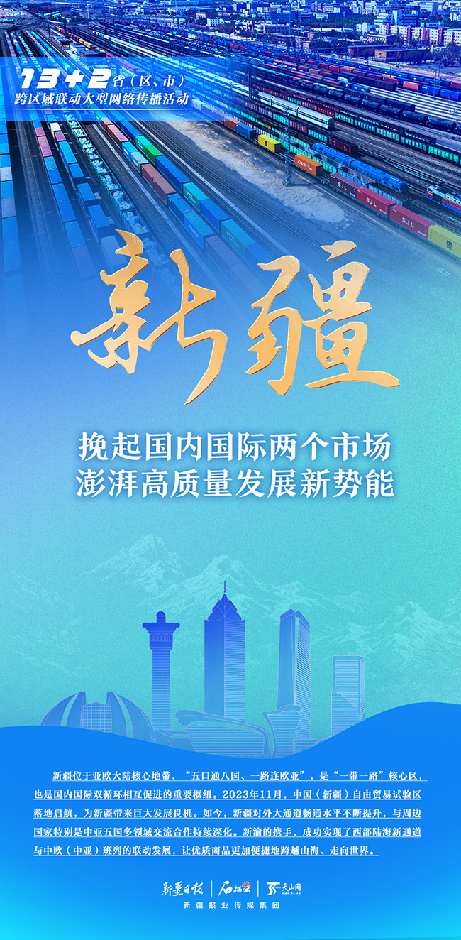 新疆位于亚欧大陆核心地带,“五口通八国、一路连欧亚”,是“一带一路”核心区,也是国内国际双循环相互促进的重要枢纽。2023年11月,中国(新疆)自由贸易试验区落地启航,为新疆带来巨大发展良机。