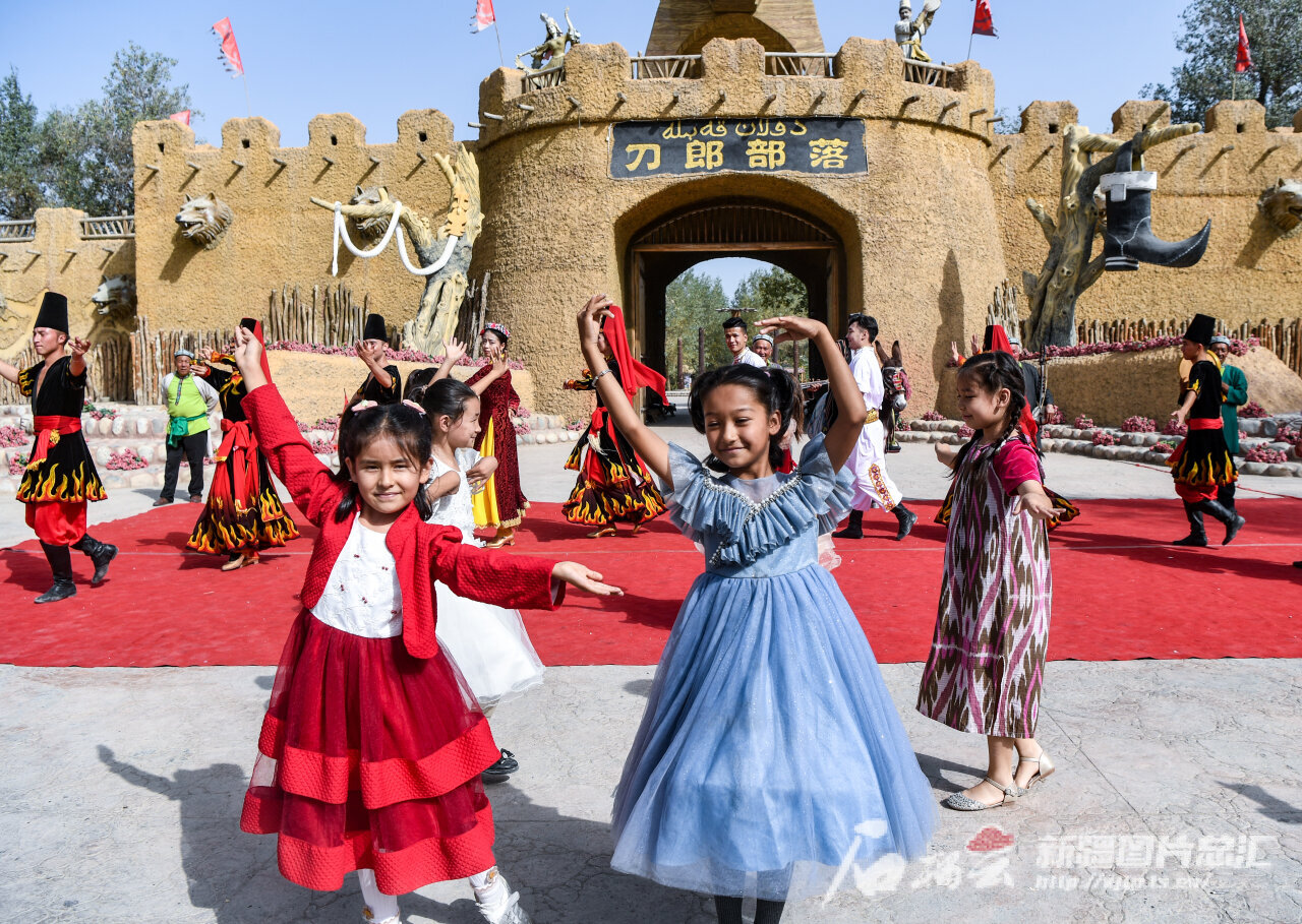 9月25日,小朋友在阿瓦提县刀郎部落景区跳舞。