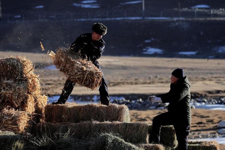 阿思里别克帮助牧民搬运草料。芦胜磊供图