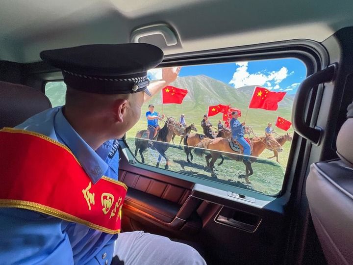 获评“全国优秀人民警察”的阿思里别克回到博州时,卡昝河的牧民群众策马高举国旗,欢迎他的归来。芦胜磊供图