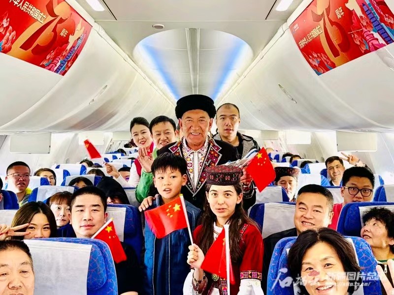 10月2日,中国南方航空CZ6805乌鲁木齐至喀什航班上,“人民卫士”国家荣誉称号获得者巴依卡·凯力迪别克受到旅客热烈欢迎。姬鑫鹏摄