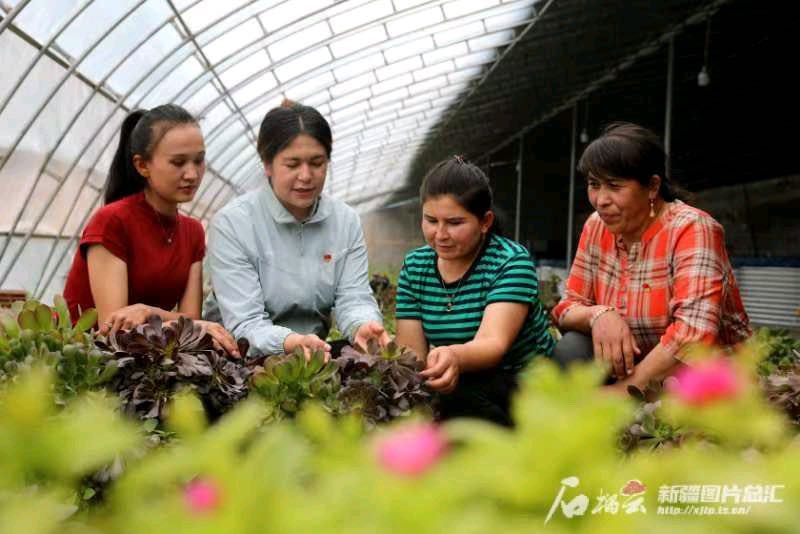 9月6日,且末县阿羌镇依山干村党支部书记阿依姆罕·伊卜拉伊木(左二)在村里的蔬菜大棚里看蔬菜长势,了解种植户经营情况。热孜玩古丽·司马义摄