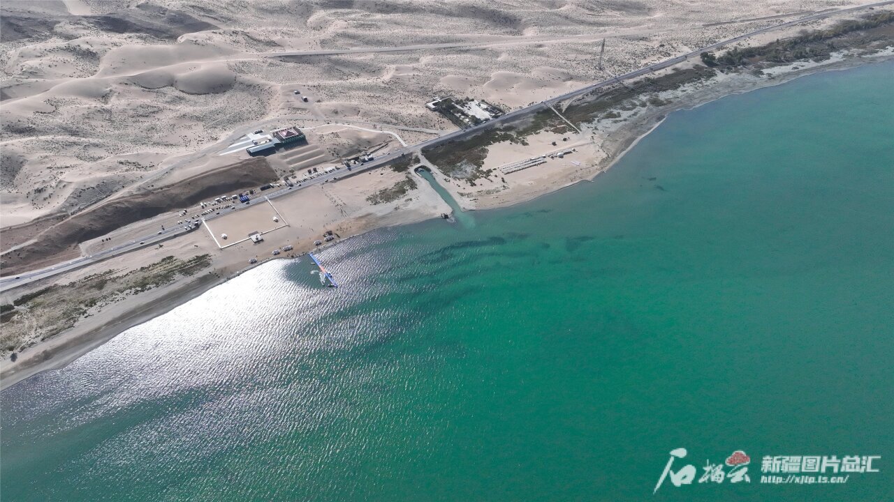 10月13日,博湖县博斯腾湖白鹭洲景区一半湖水、一半沙漠的壮丽景象(无人机摄)。年磊 摄