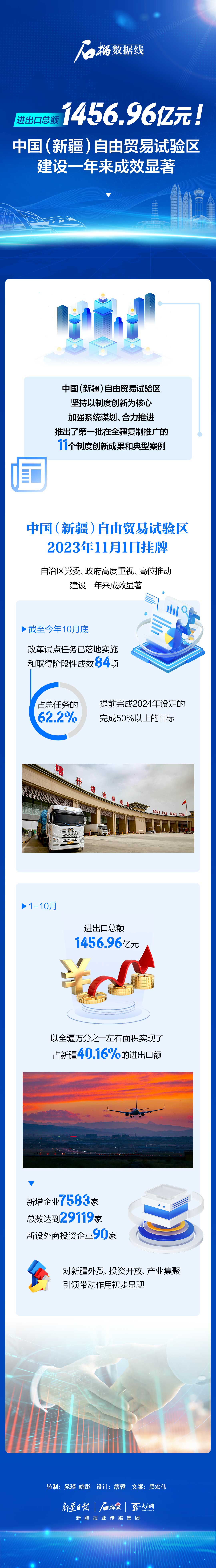 中国(新疆)自由贸易试验区2023年11月1日挂牌,自治区党委、政府高度重视、高位推动,建设一年来成效显著。截至今年10月底,改革试点任务已落地实施和取得阶段性成效84项,占总任务的62.2%,提前完成2024年设定的完成50%以上的目标。1-10月,中国(新疆)自由贸易试验区进出口总额1456.96亿元,以全疆万分之一左右面积实现了占新疆40.16%的进出口额。