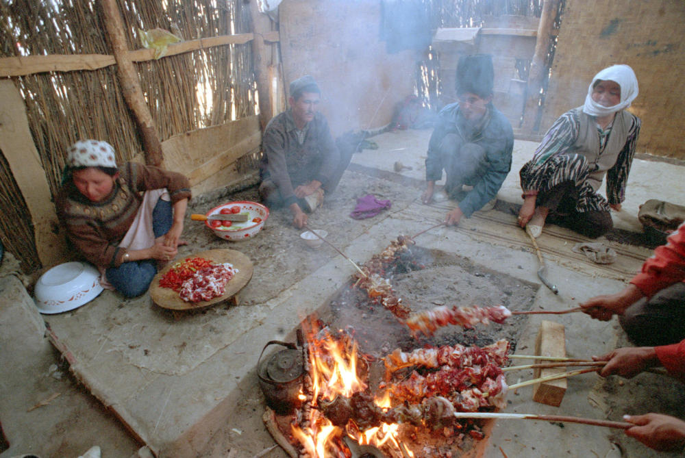 1999年,人们在婚礼上制作用红柳枝串起的大块烤肉。