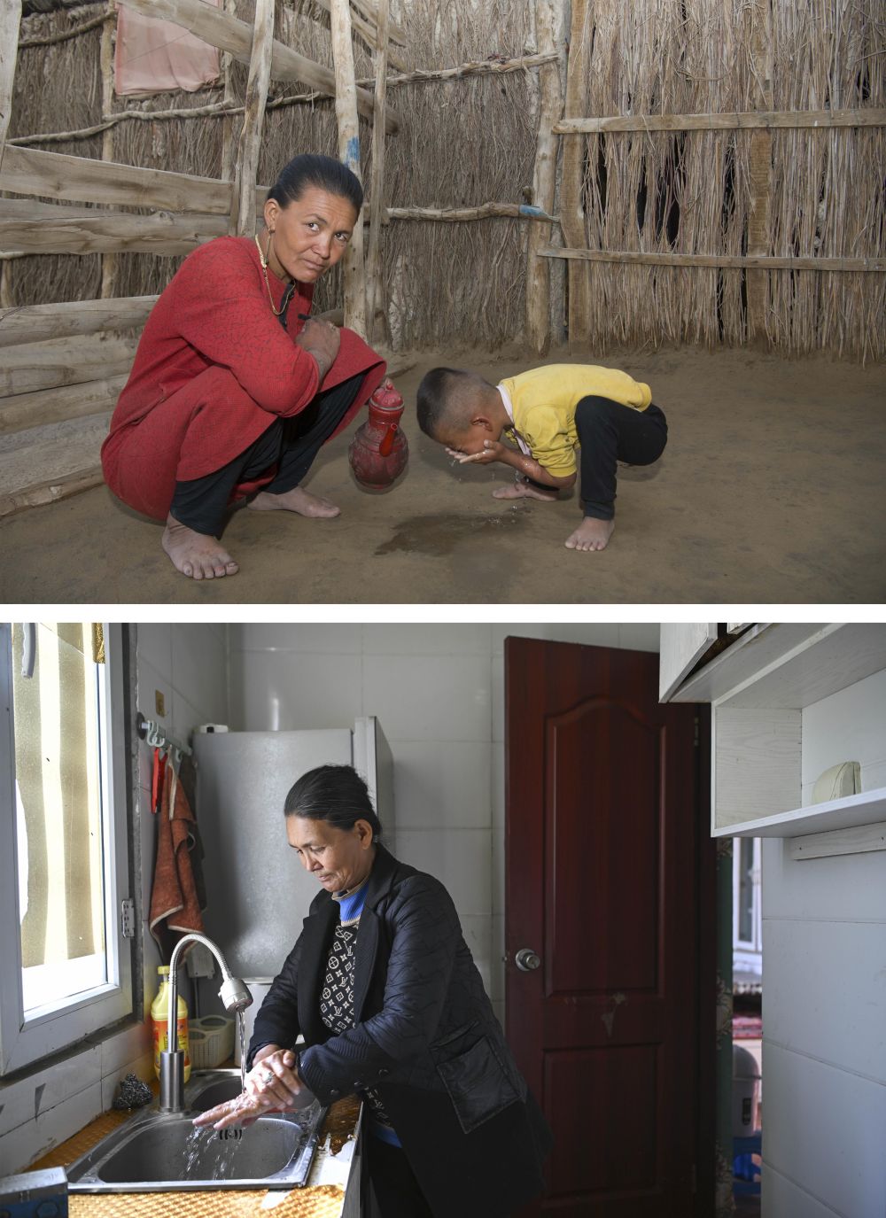 拼版照片:上图为搬迁前,达里雅布依村村民库尔班罕·麦麦提热依木给小孙子倒水洗脸(2018年9月6日摄);下图为库尔班罕在新村家中洗手(2024年11月7日摄)。