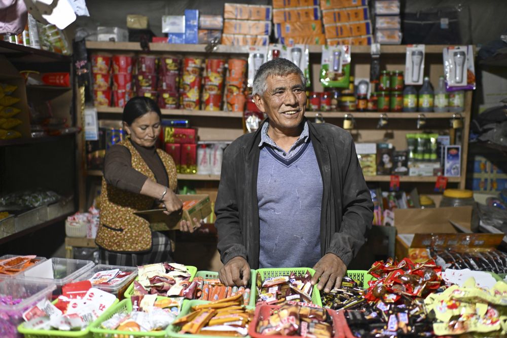 2024年11月5日,在达里雅布依旧址景区,村民艾尼瓦尔·买提斯地克(右)和妻子在自家经营的小商店接待顾客。