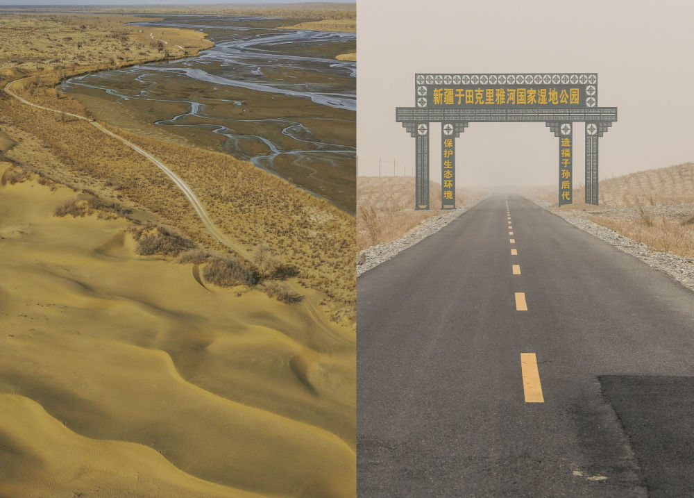拼版照片:左图为沿着克里雅河通向地处沙漠深处达里雅布依旧址的路(2019年3月19日无人机拍摄);右图为从县城通往达里雅布依新村的柏油路(2019年3月20日摄)。