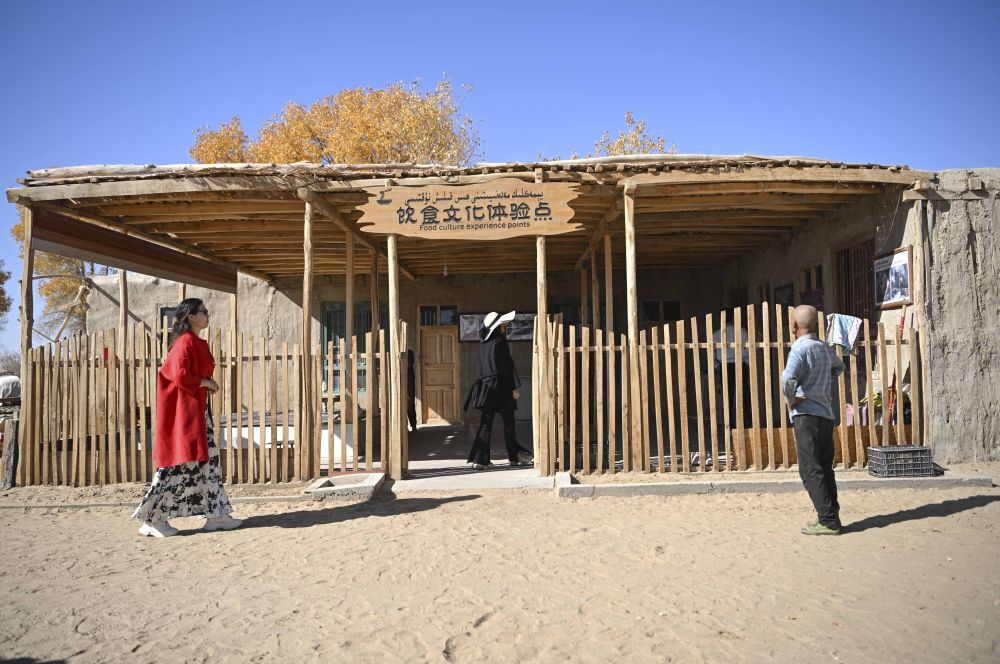 2024年11月7日,在达里雅布依旧址景区,游客来到村民托合提·依明(右)的老房子参观。