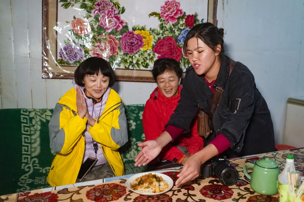 2019年11月13日,在达里雅布依乡,库尔班罕·买提肉孜(右)在一户旅游合作社成员的民宿餐厅为游客端上当地的特色面食拉条子。